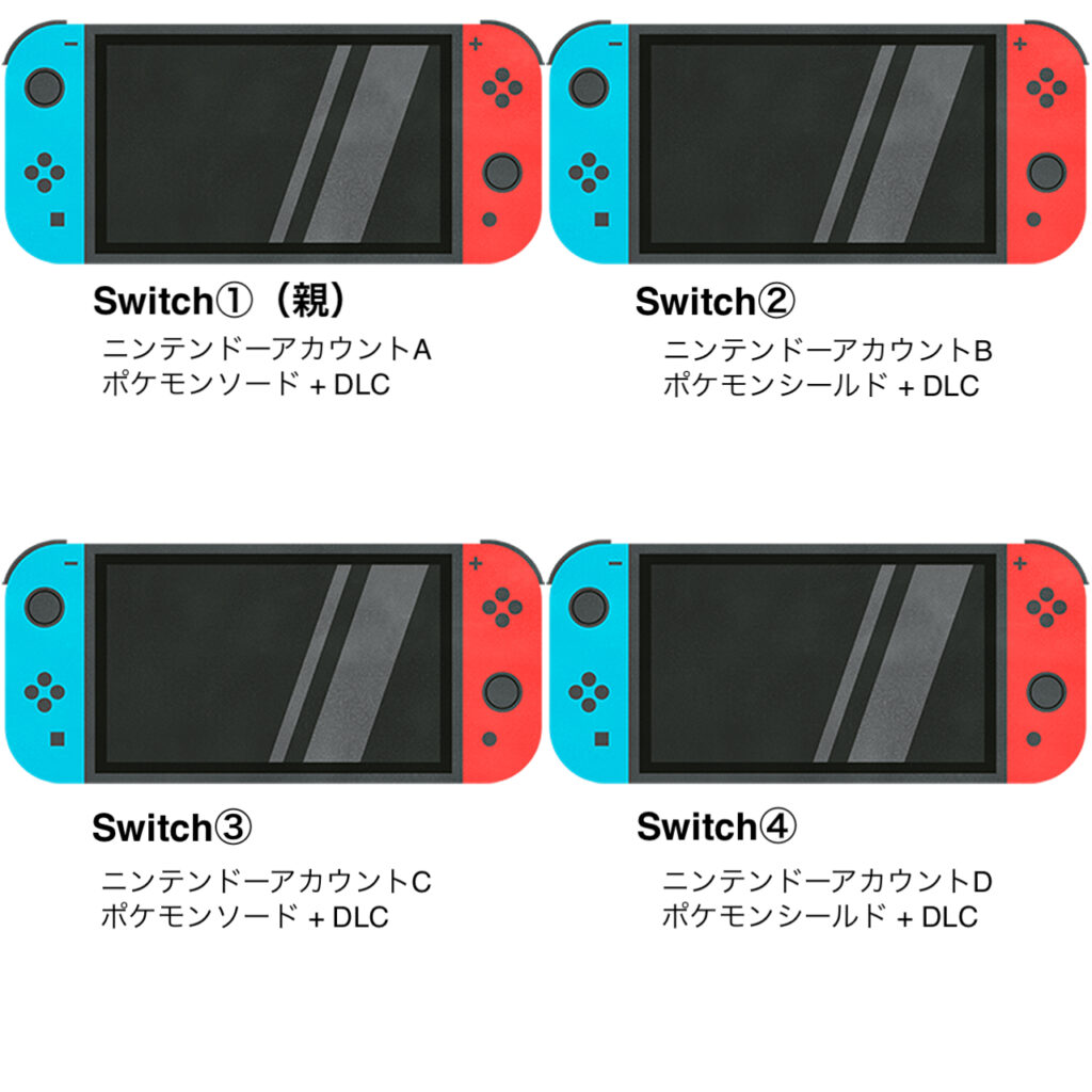 ※ニンテンドーアカウント2つだけを使う都合上、ソード2つシールド2つを準備する必要あり - エキスパンションパス4つ