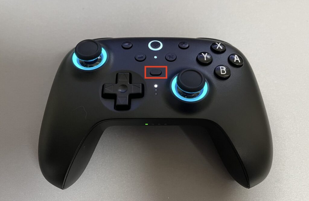 コントローラーの中央にある横長のボタンを押します。