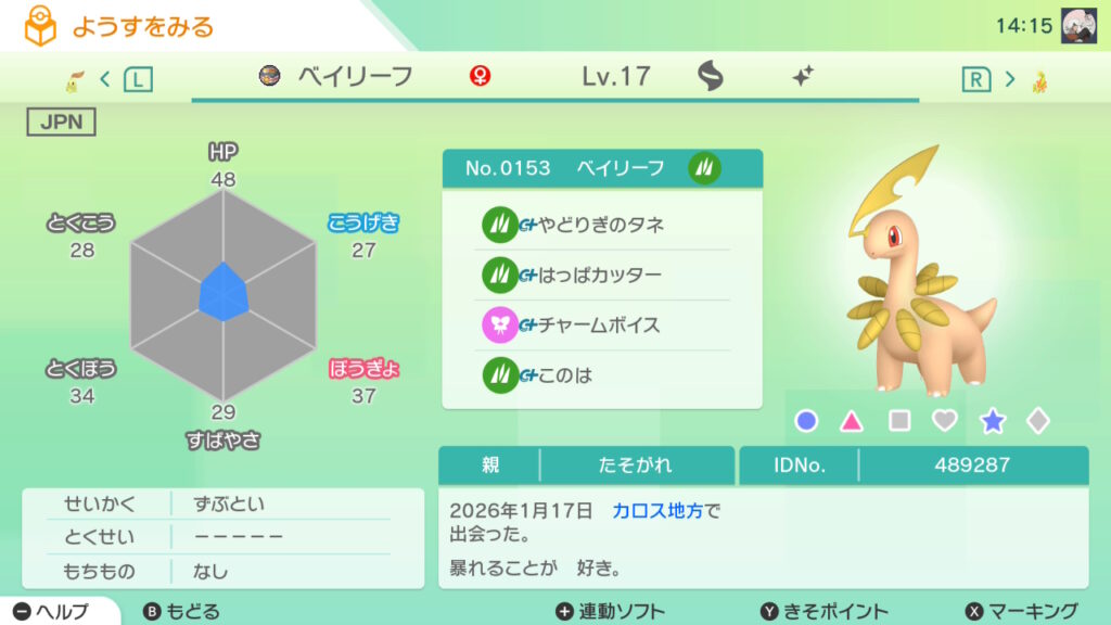 図鑑No.153 『ベイリーフ』の色違いの見分け方をソフト別に解説