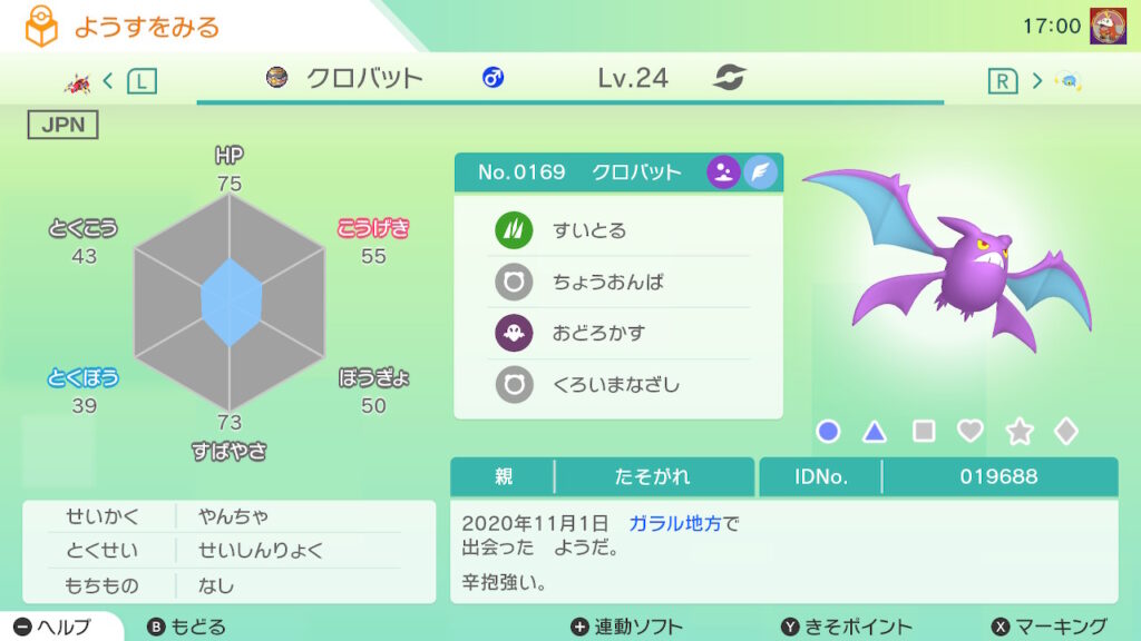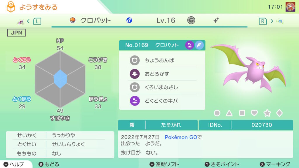 - 色違い(♂)がポケモンGO産のためゴージャスボールではない。
