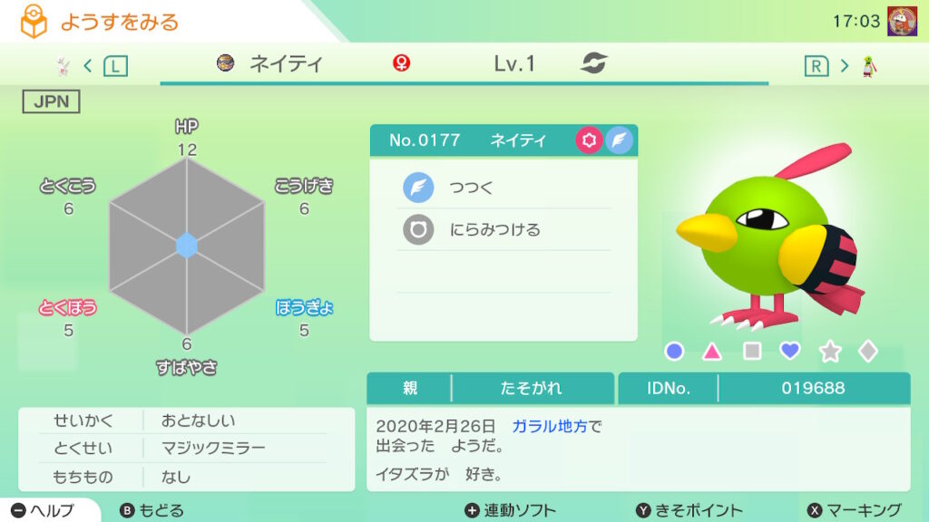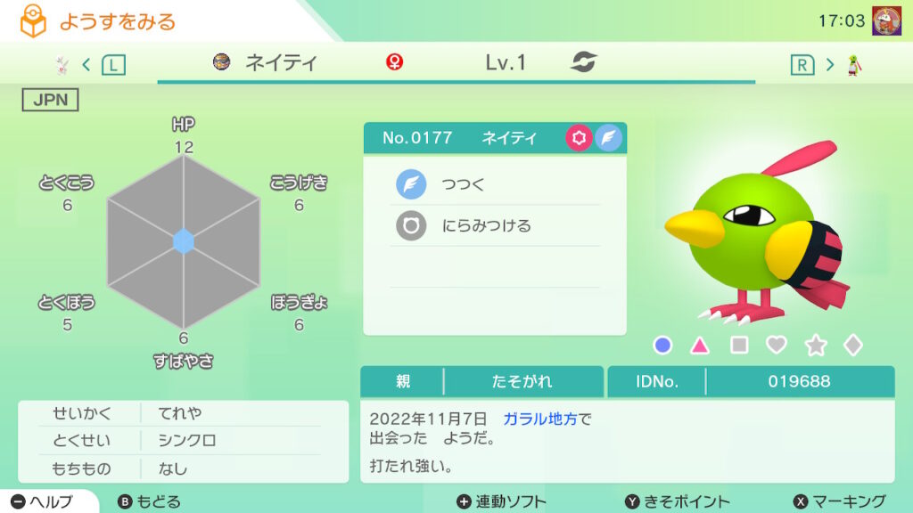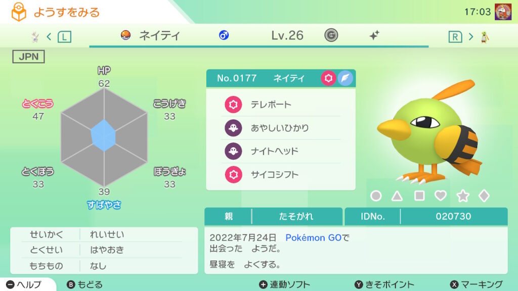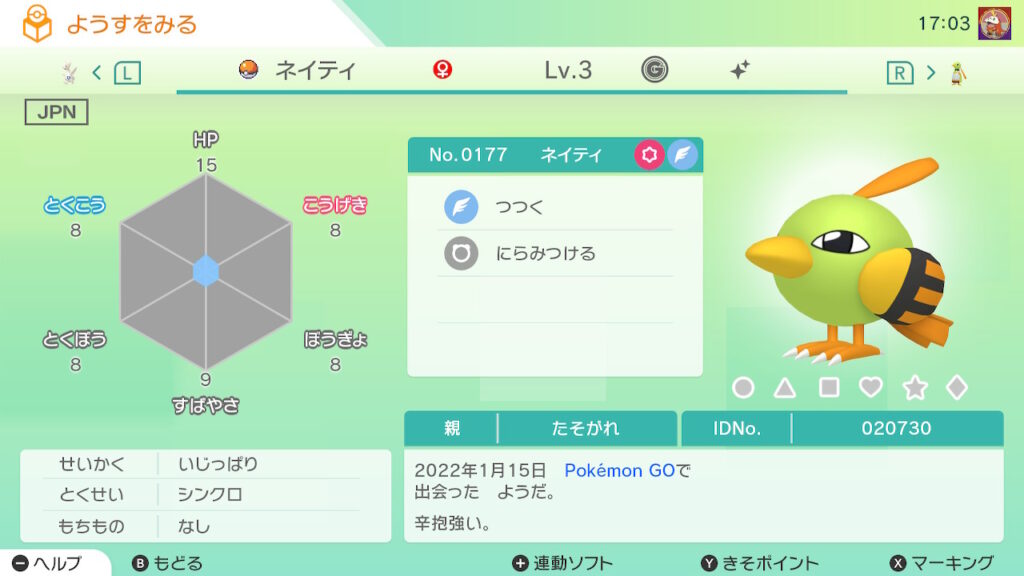- 色違い(♀)がポケモンGO産のためゴージャスボールではない。