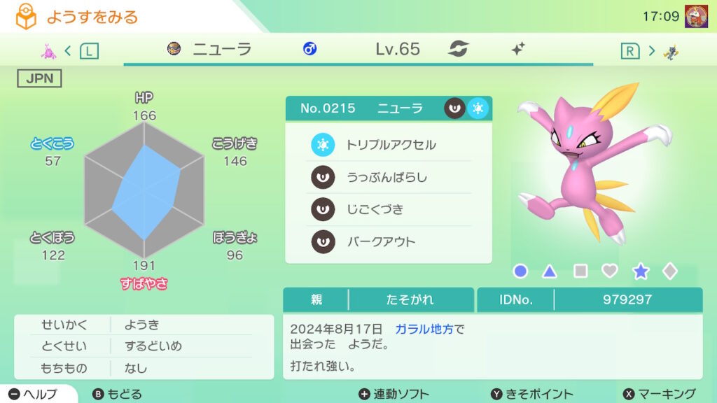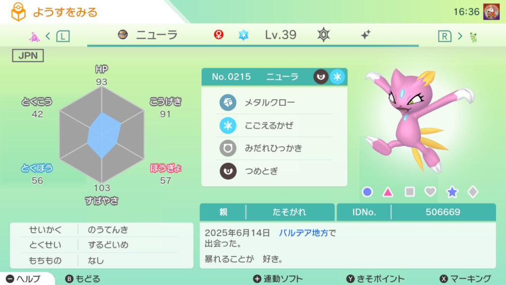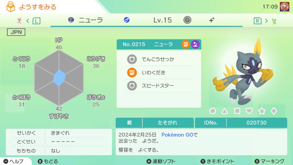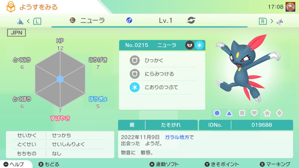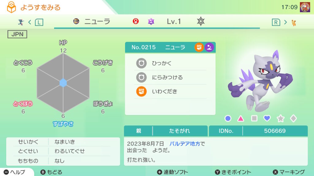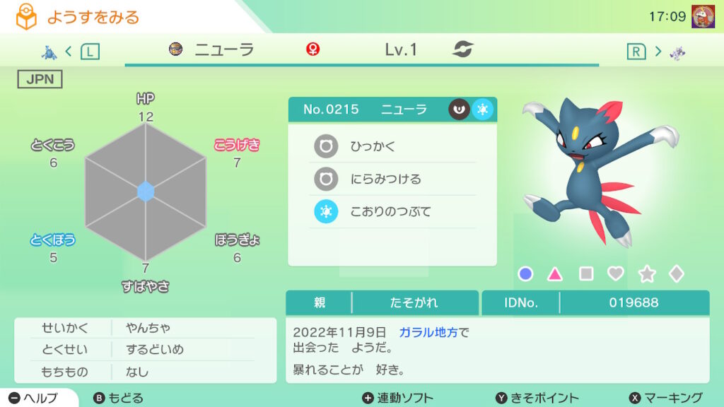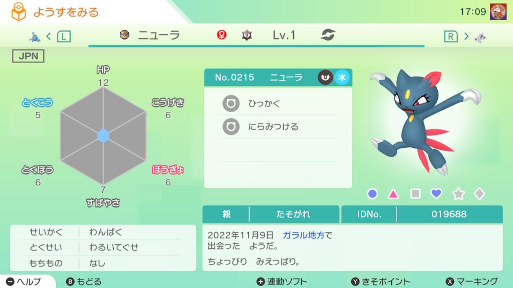 - ニューラ(ヒスイ)の色違い(♀)を未所持。