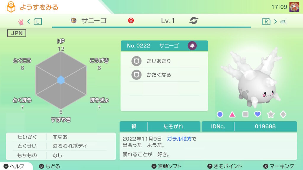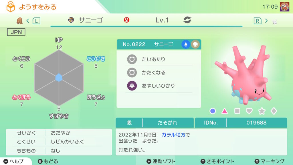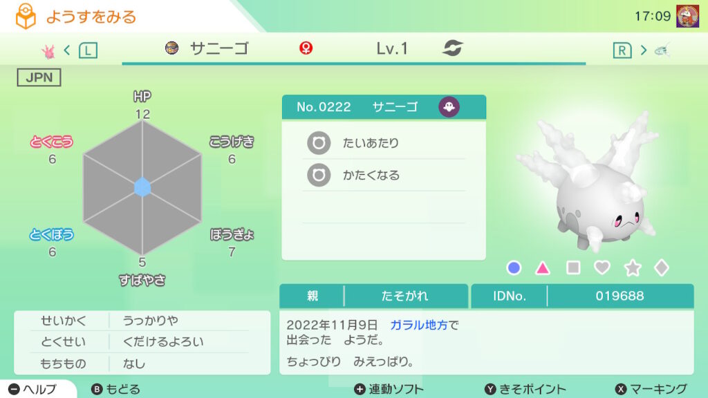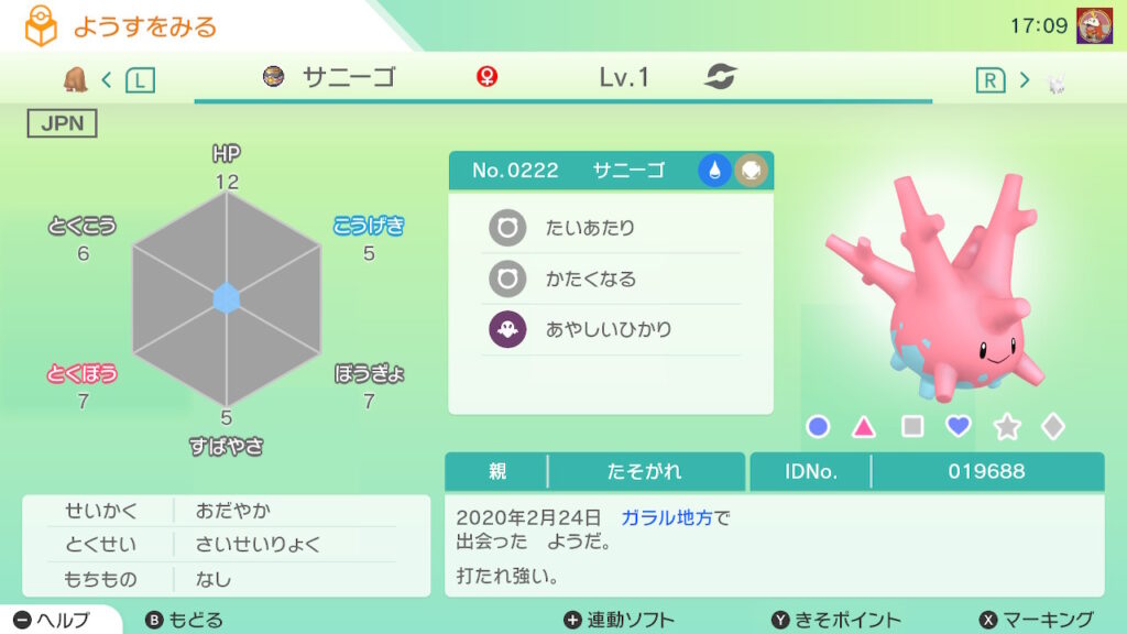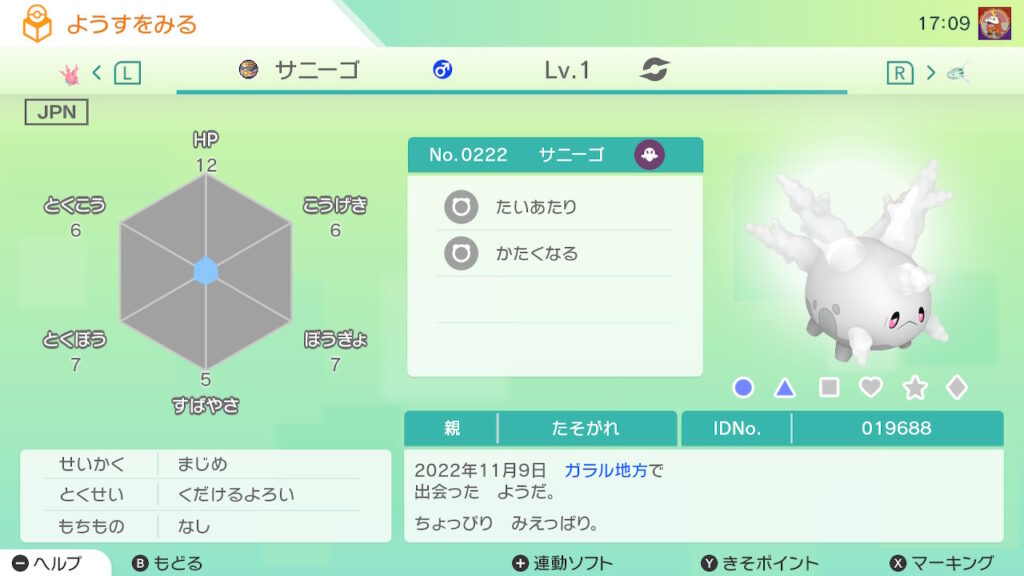 - サニーゴ(ガラル)の色違い(♂)を未所持。