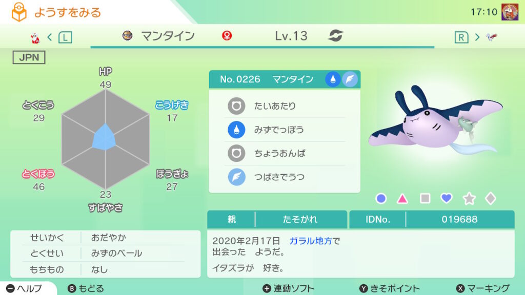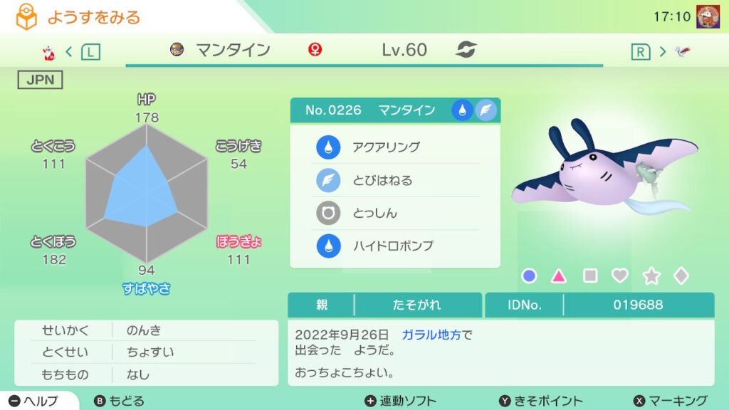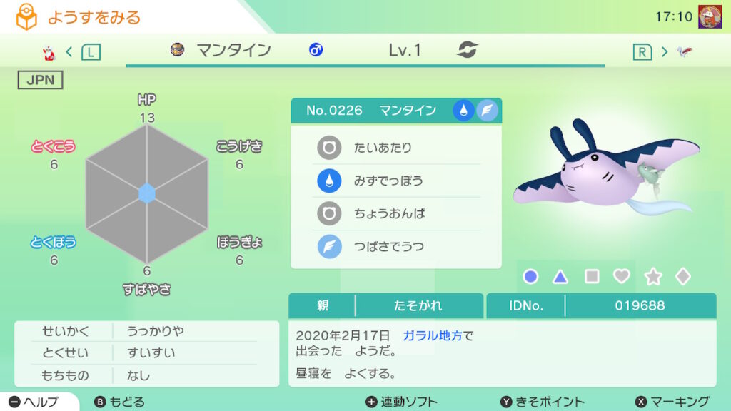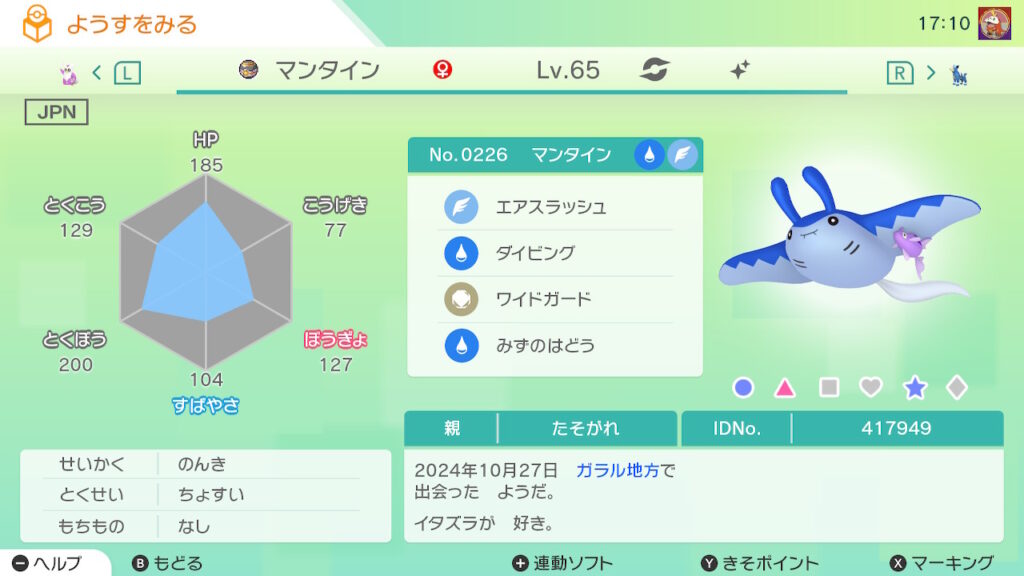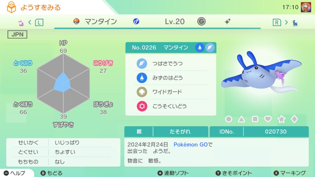 - 色違い(♂)がポケモンGO産のためゴージャスボールではない。