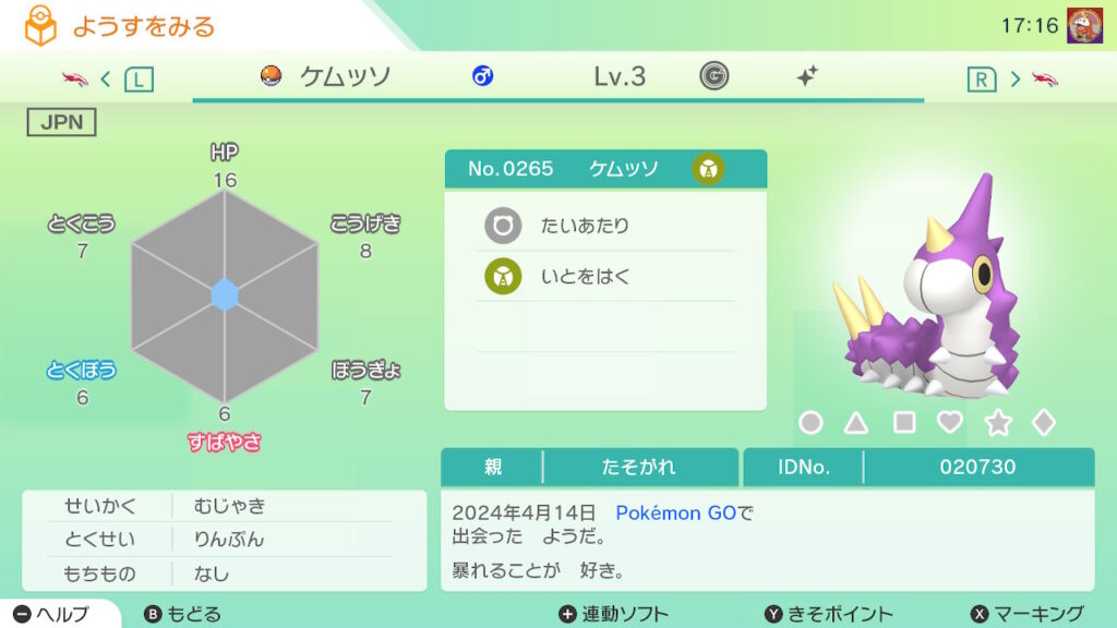- 色違い(♂)がポケモンGO産のためゴージャスボールではない。
