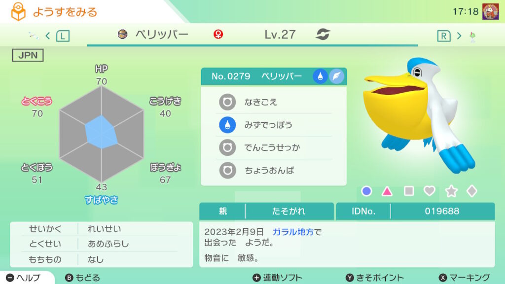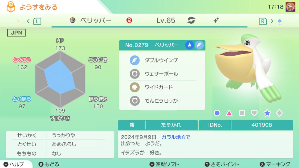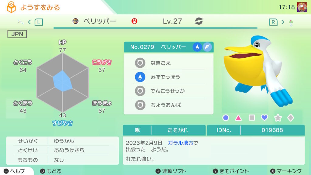 図鑑No.279 『ペリッパー』の色違いの見分け方をソフト別に解説