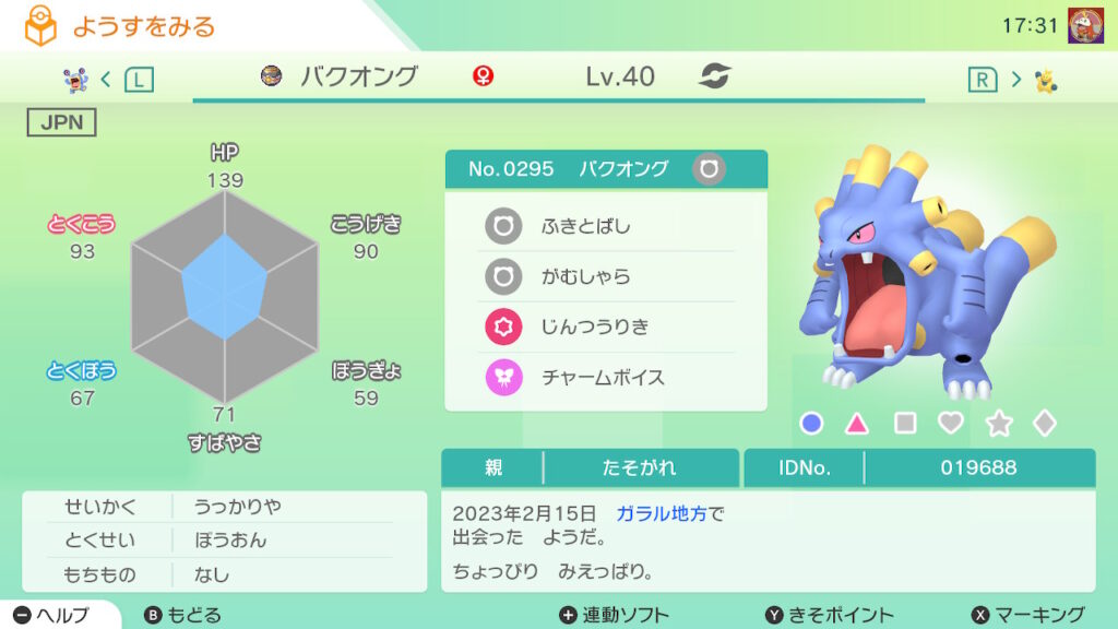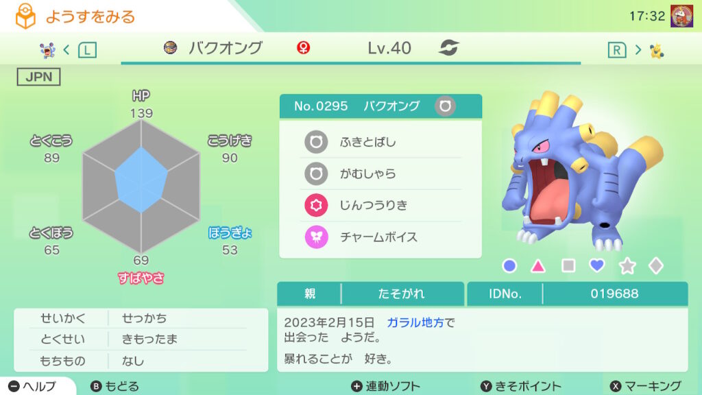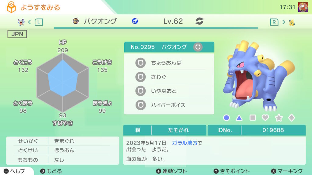 図鑑No.295 『バクオング』の色違いの見分け方をソフト別に解説