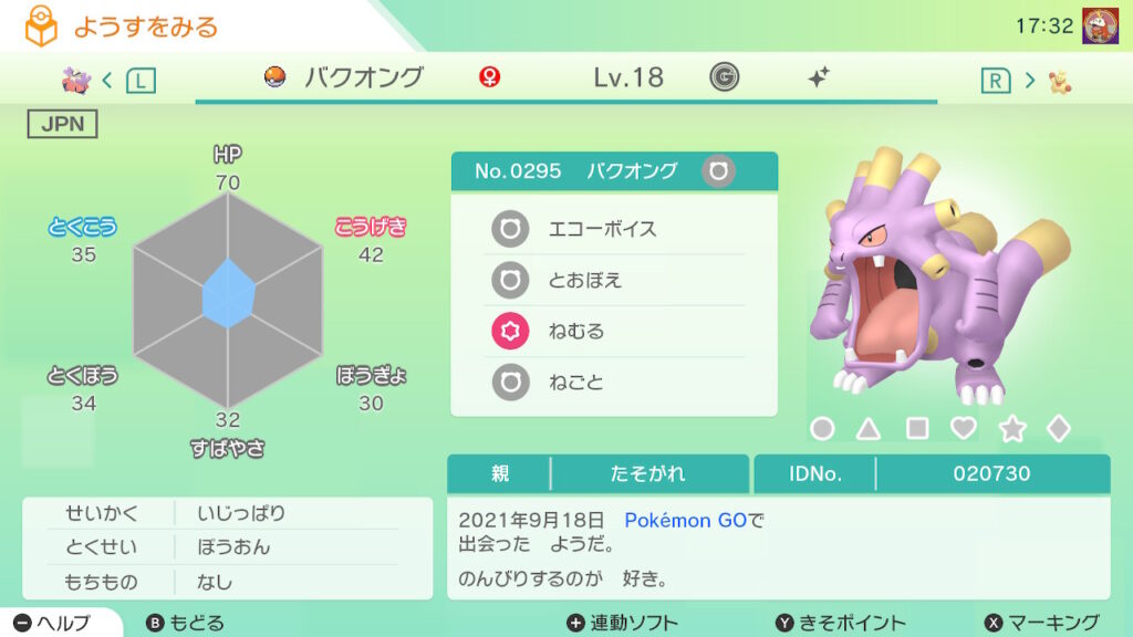 • 色違い(♀)がポケモンGO産のためゴージャスボールではない。