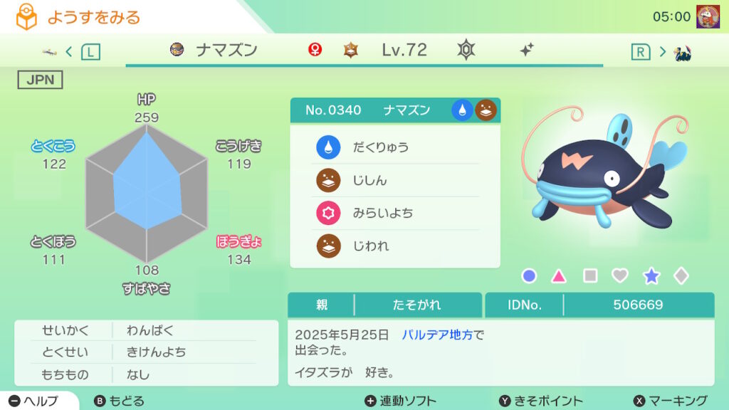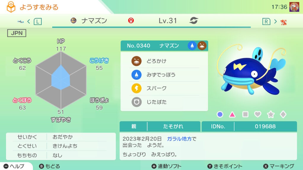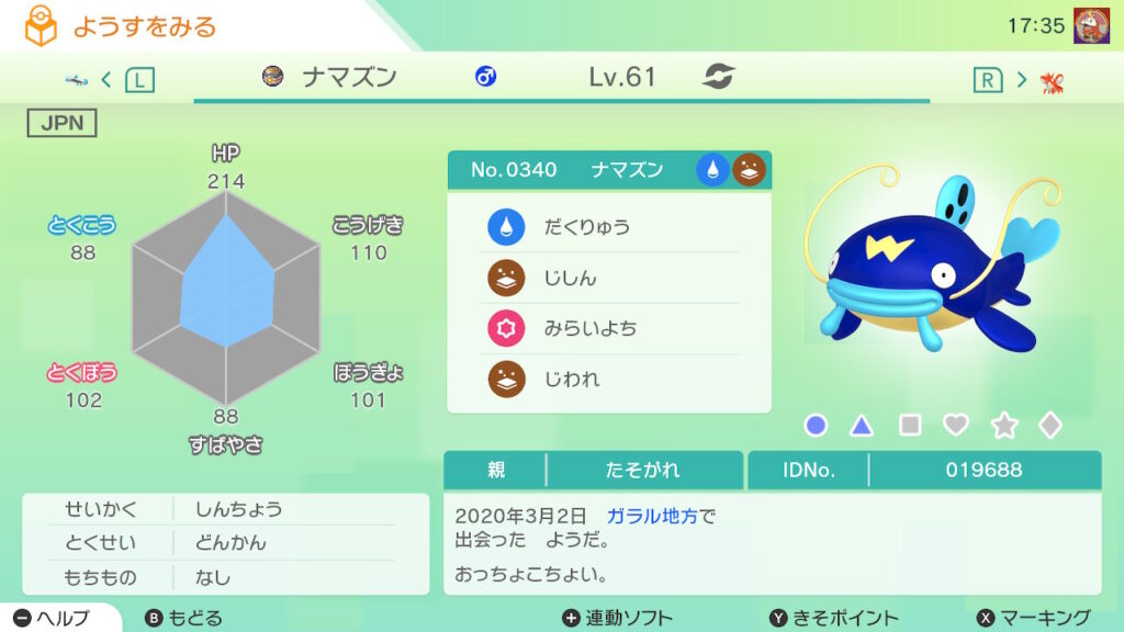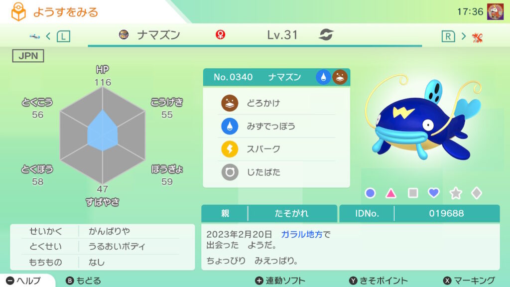 図鑑No.340 『ナマズン』の色違いの見分け方をソフト別に解説