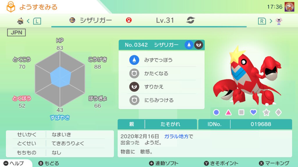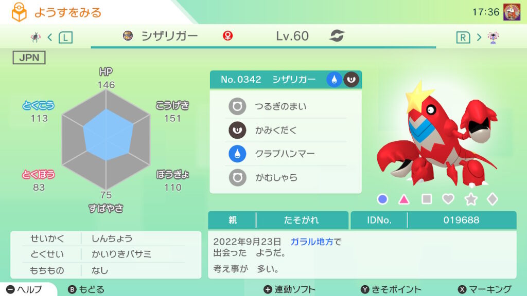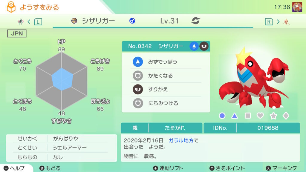 図鑑No.342 『シザリガー』の色違いの見分け方をソフト別に解説
