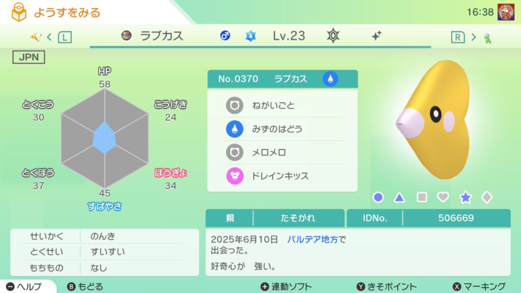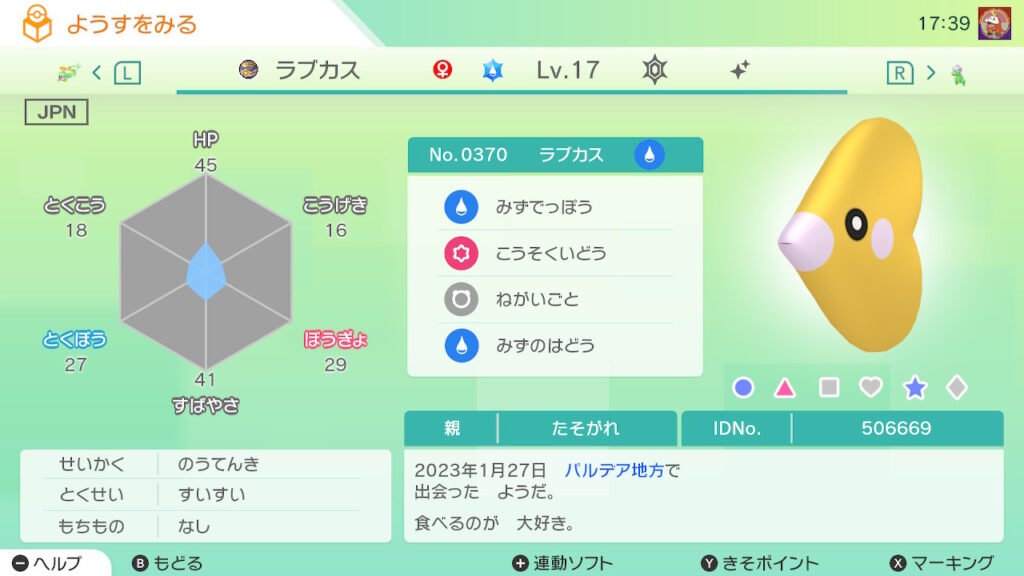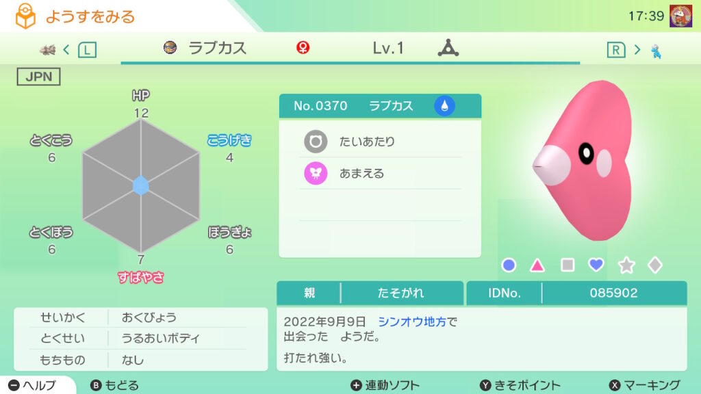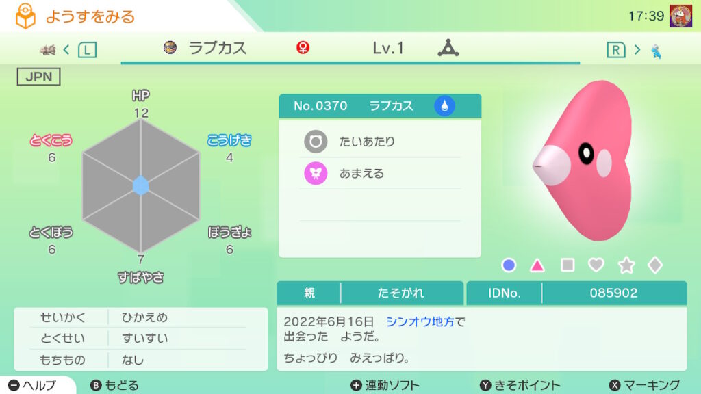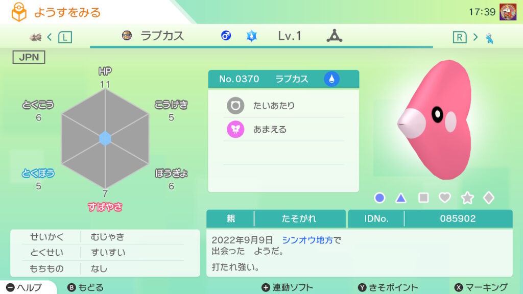 図鑑No.370 『ラブカス』の色違いの見分け方をソフト別に解説