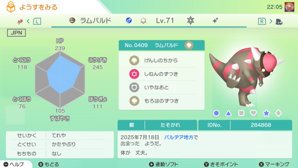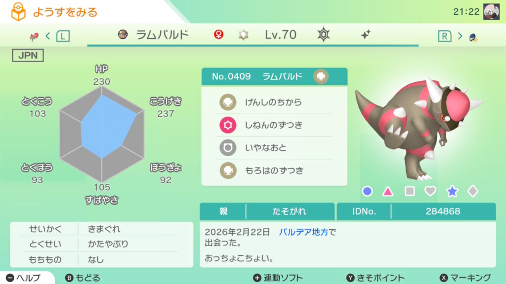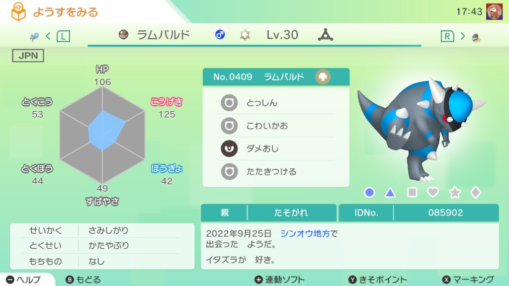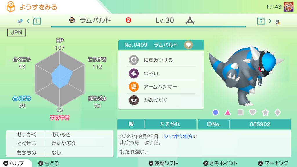 図鑑No.409 『ラムパルド』の色違いの見分け方をソフト別に解説