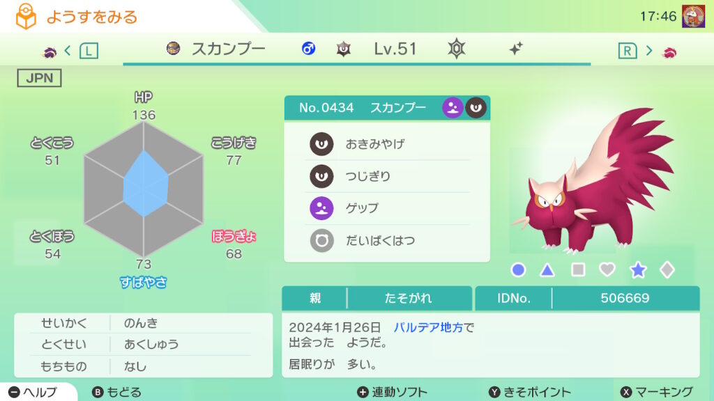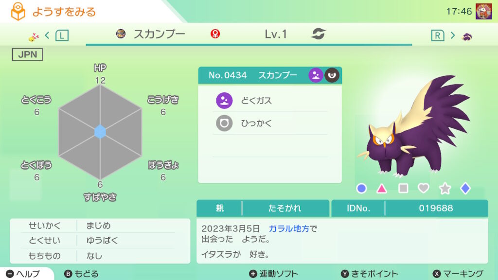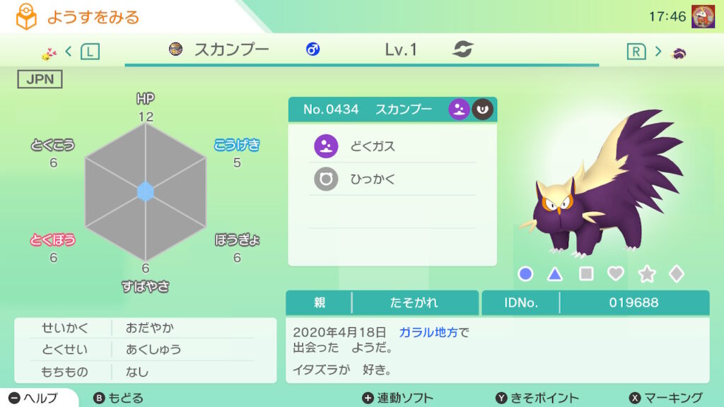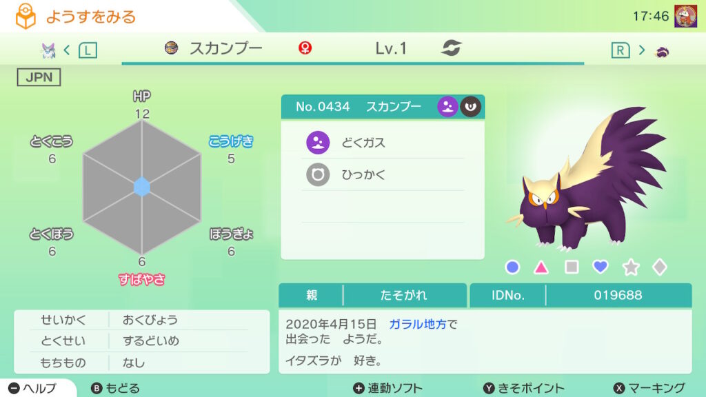 図鑑No.434 『スカンプー』の色違いの見分け方をソフト別に解説