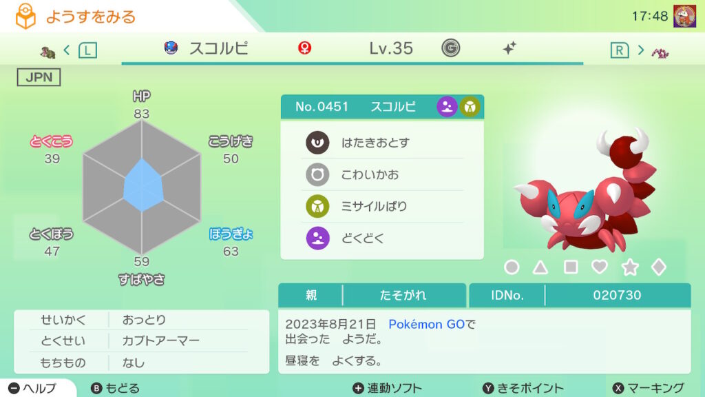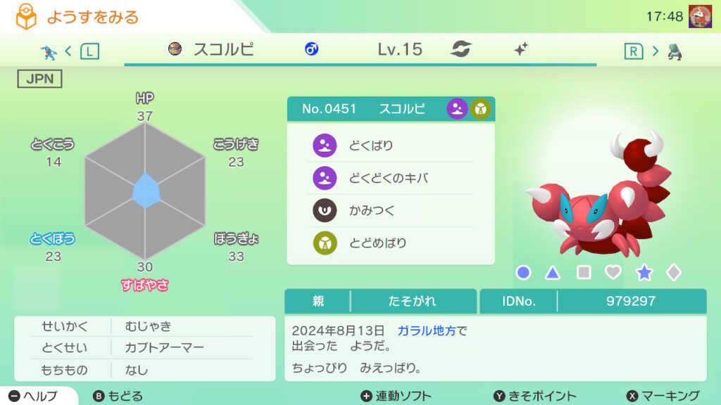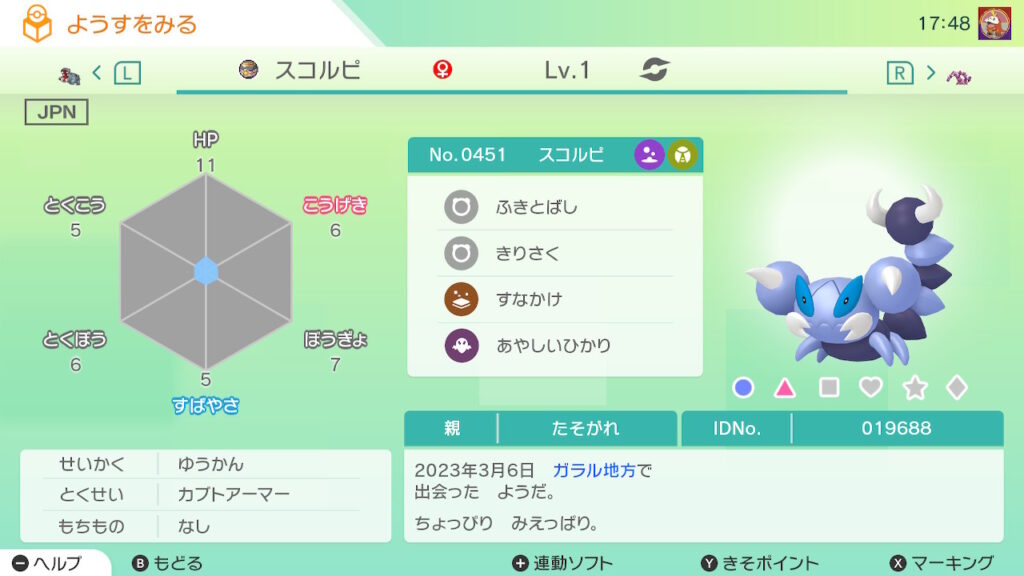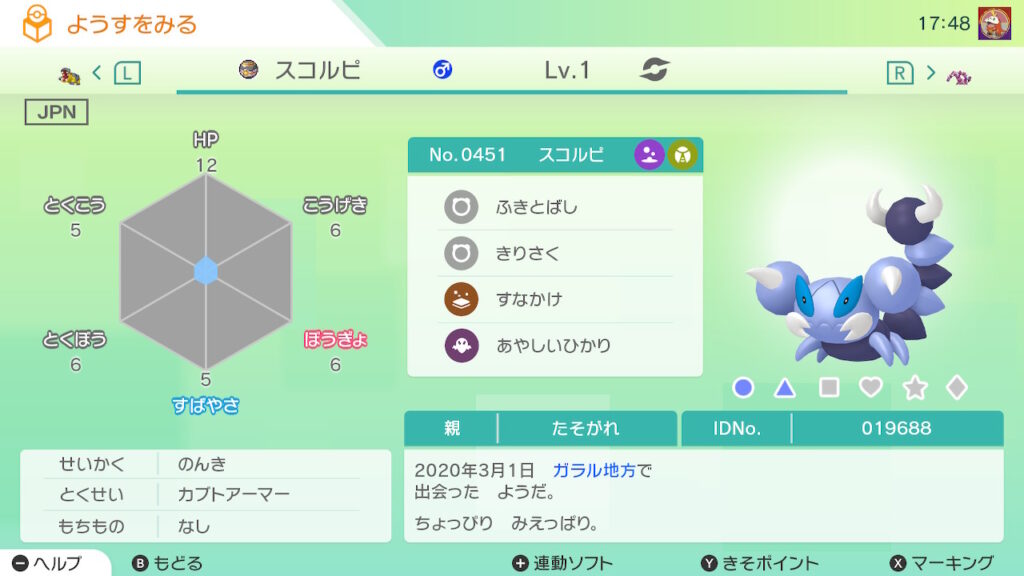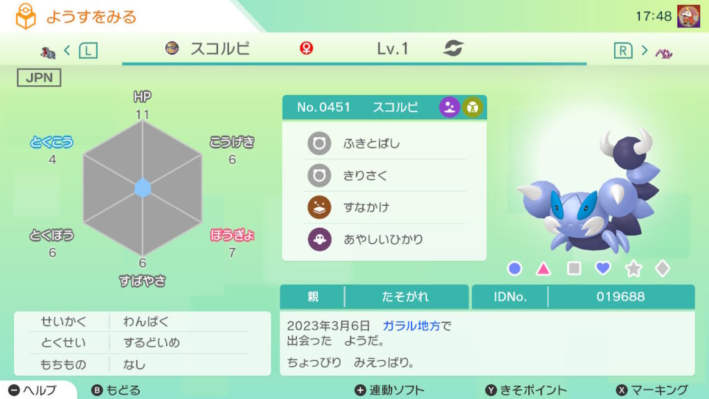 図鑑No.451 『スコルピ』の色違いの見分け方をソフト別に解説