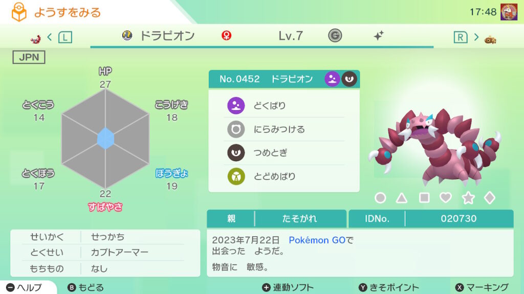 - 色違い(♀)がポケモンGO産のためゴージャスボールではない。