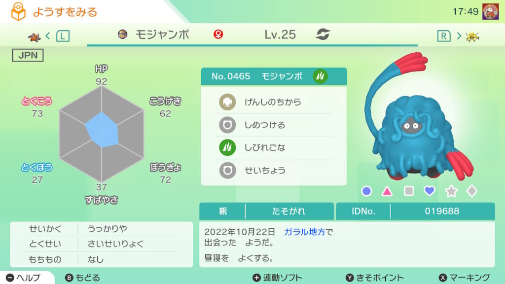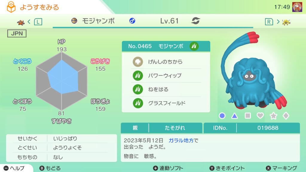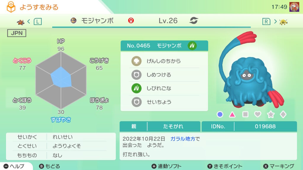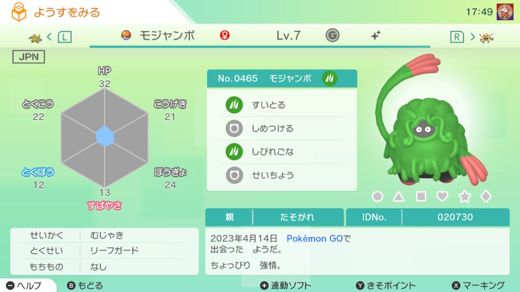 図鑑No.465 『モジャンボ』の色違いの見分け方をソフト別に解説