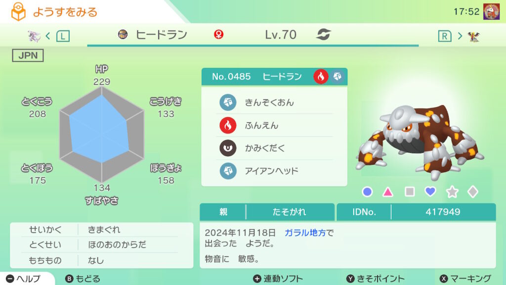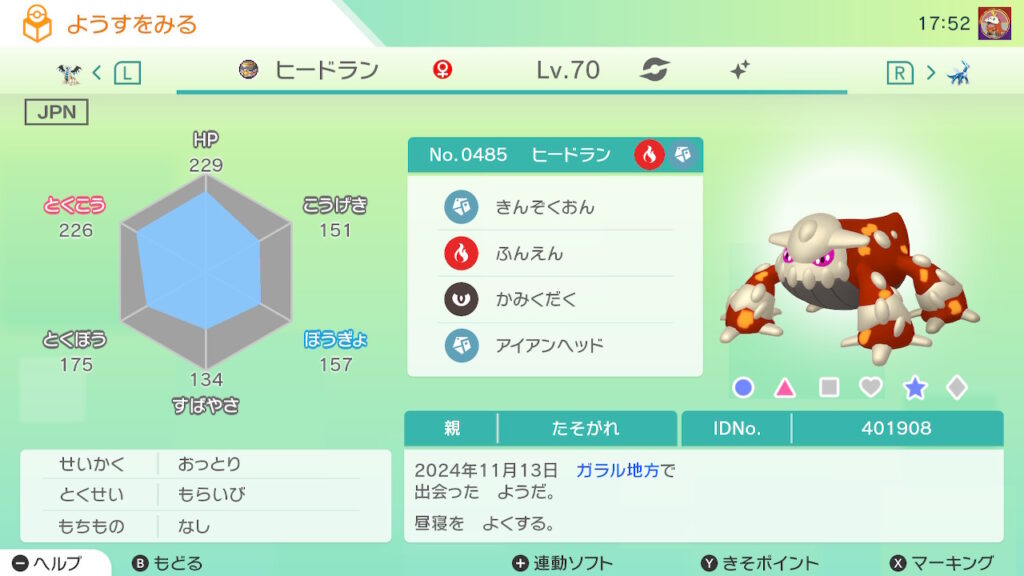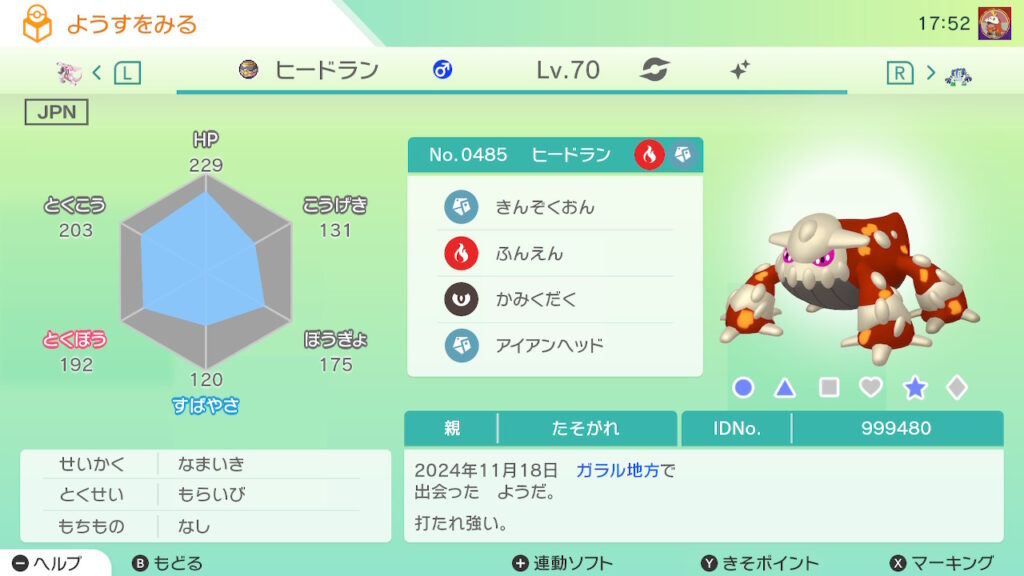 図鑑No.485 『ヒードラン』の色違いの見分け方をソフト別に解説