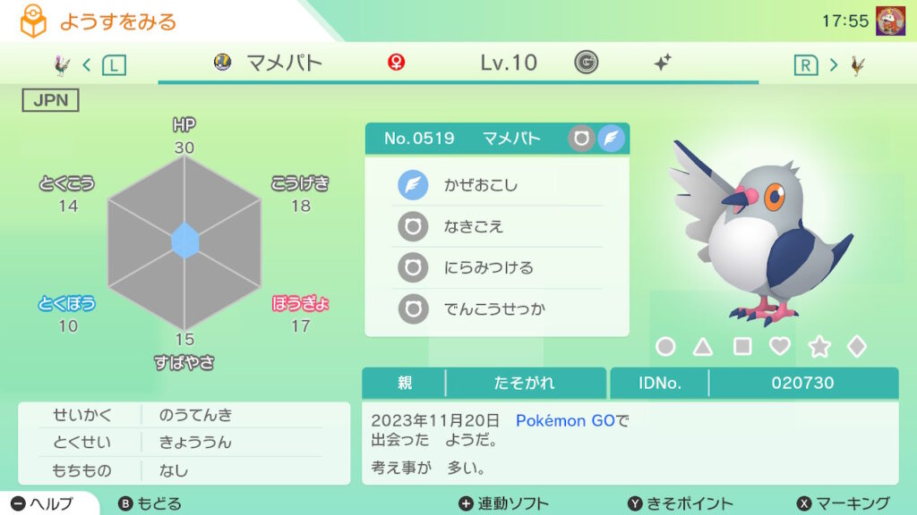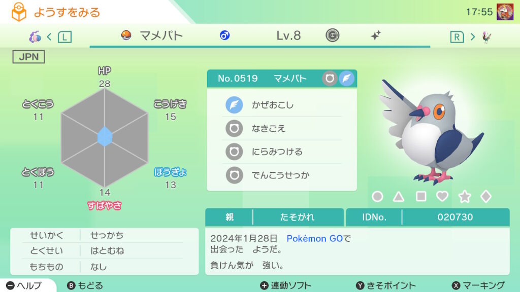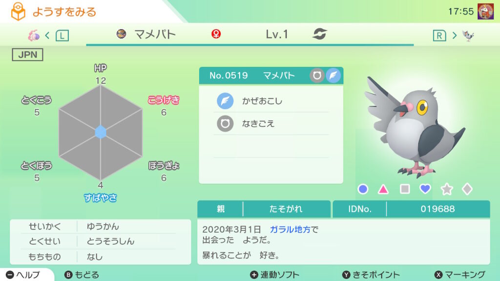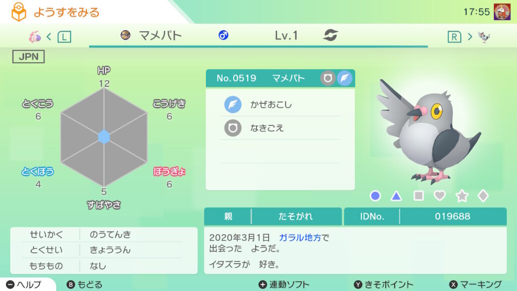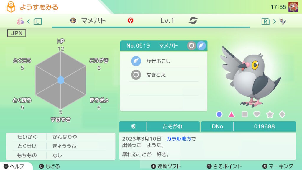 図鑑No.519 『マメパト』の色違いの見分け方をソフト別に解説