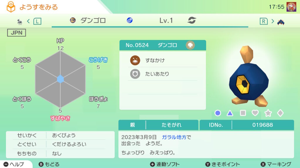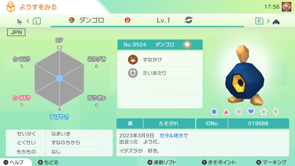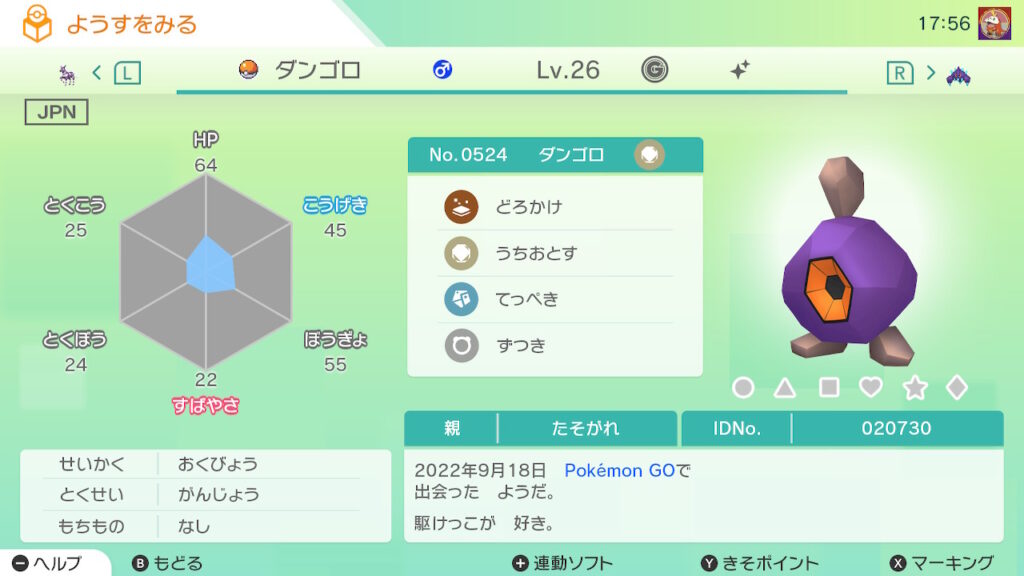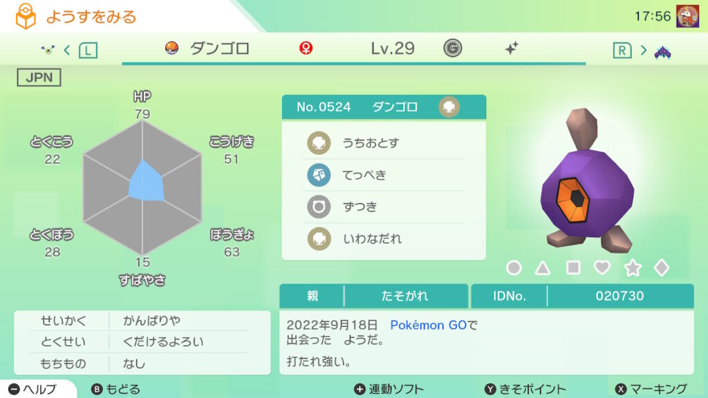 図鑑No.524 『ダンゴロ』の色違いの見分け方をソフト別に解説