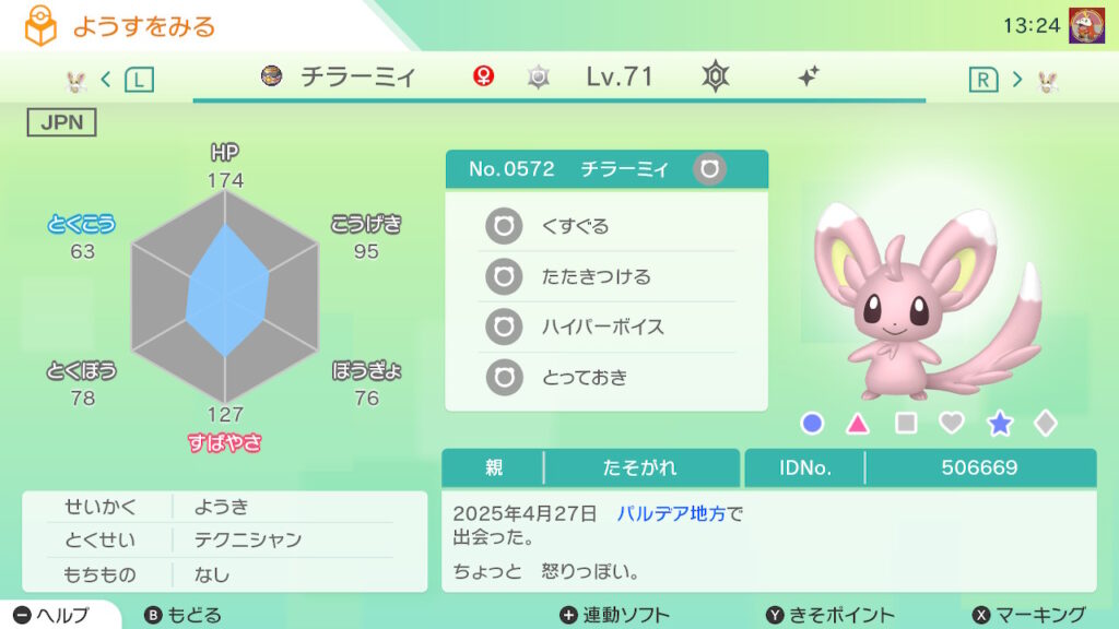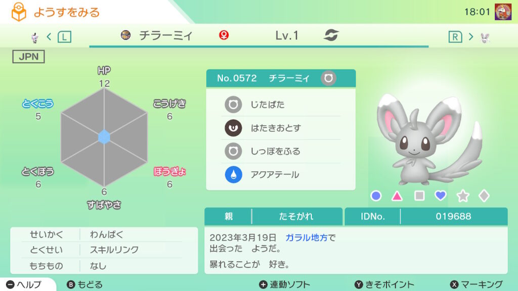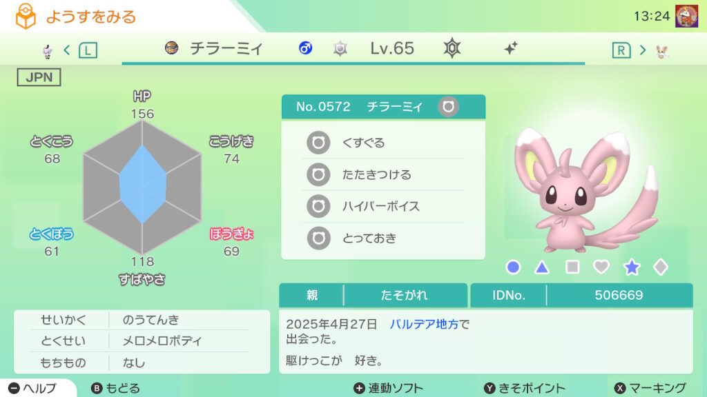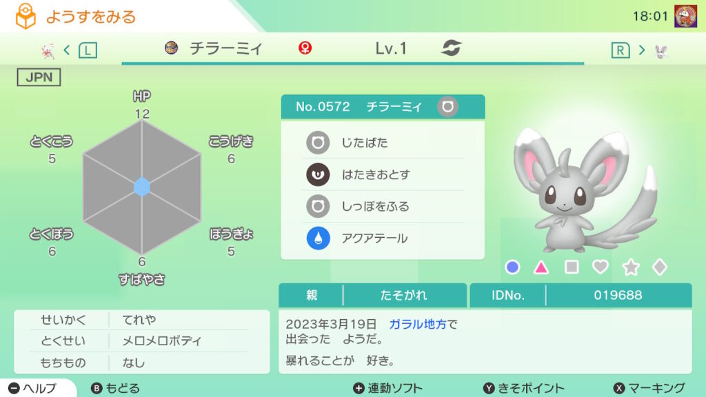 図鑑No.572 『チラーミィ』の色違いの見分け方をソフト別に解説