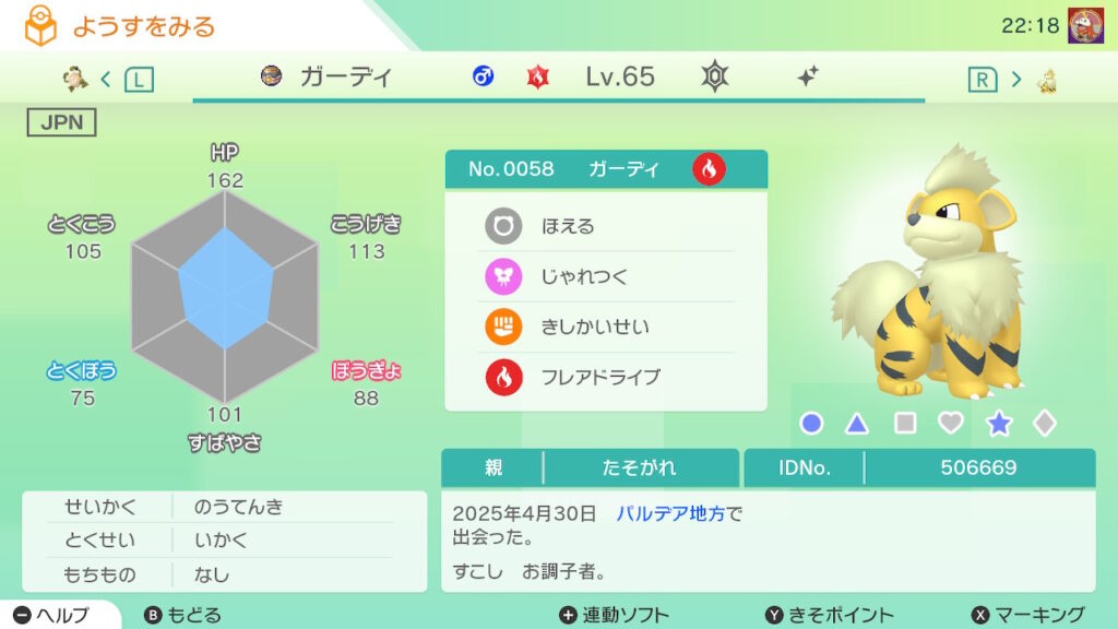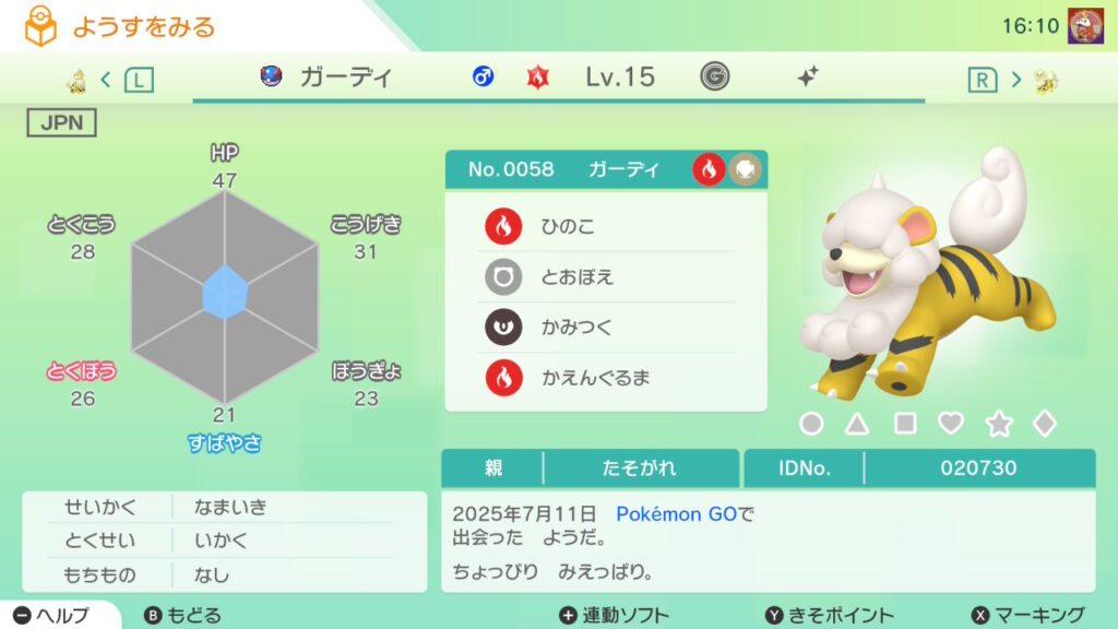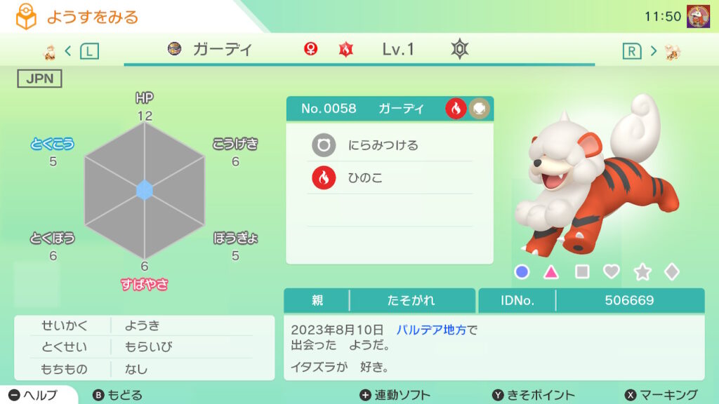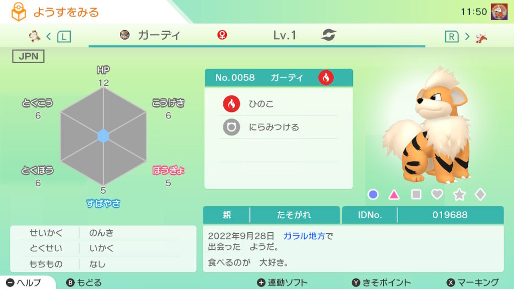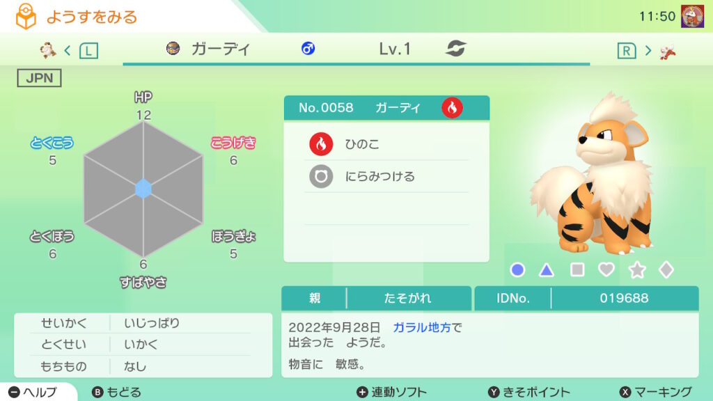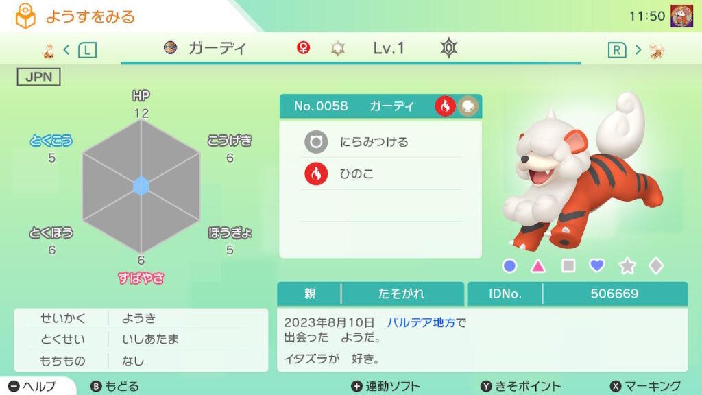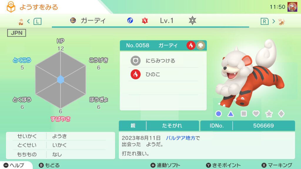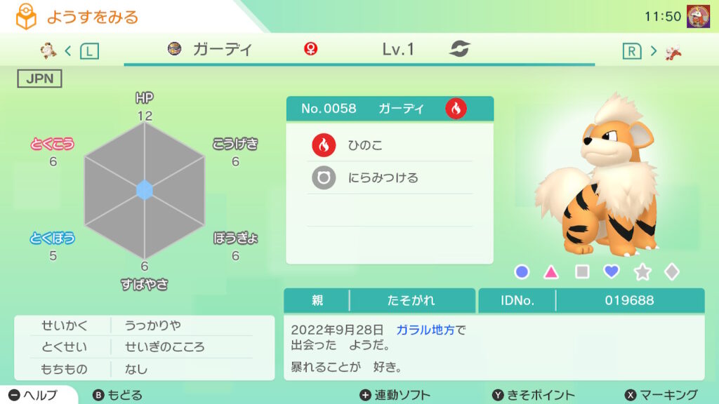 - ガーディ(ヒスイ)の色違い(♀)を未所持。