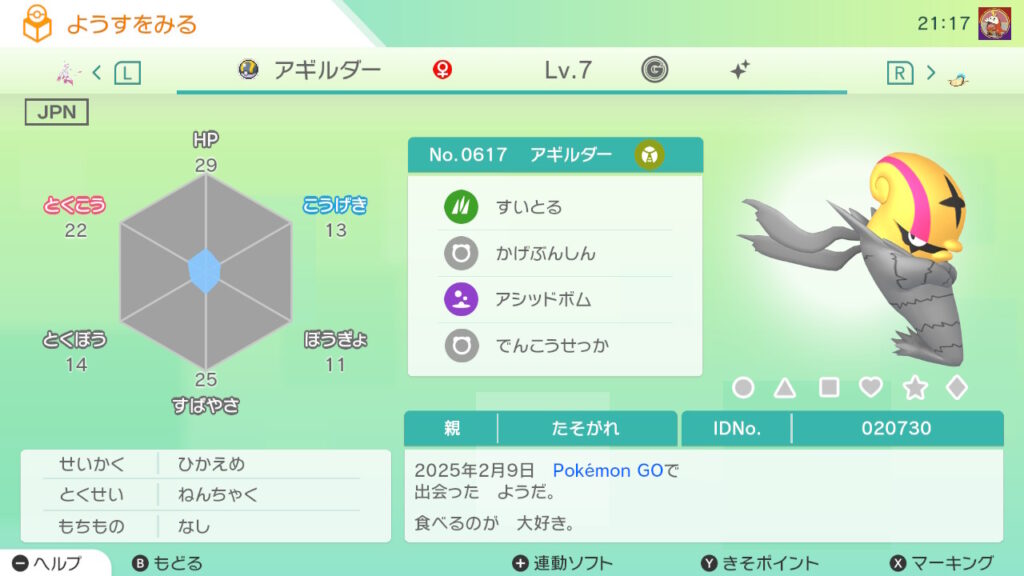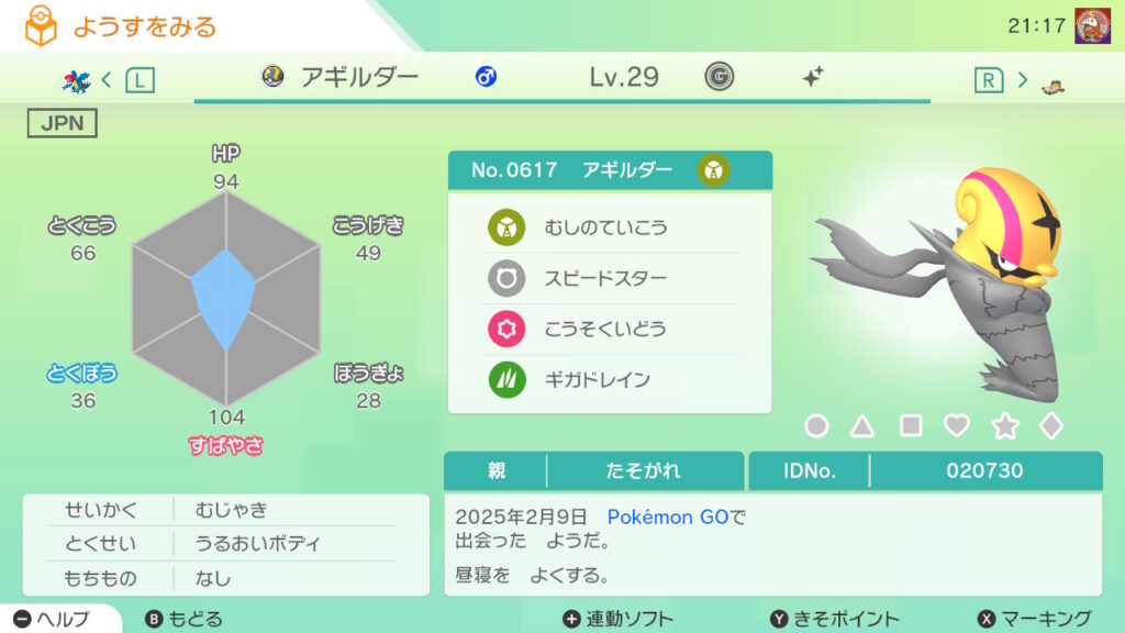 - 色違い(♀)がポケモンGO産のためゴージャスボールではない。