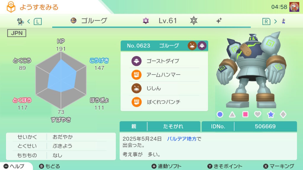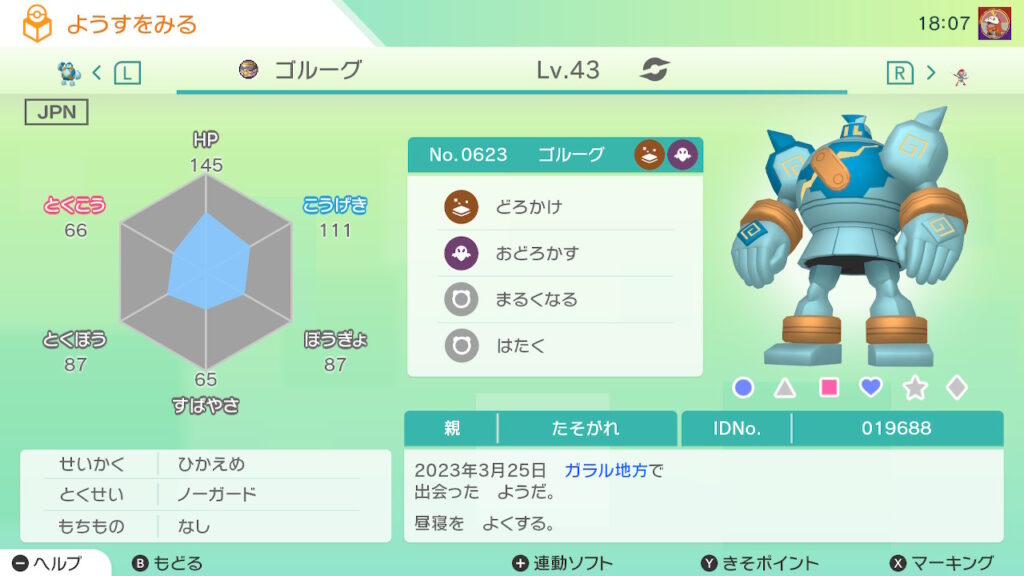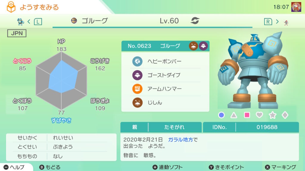 図鑑No.623 『ゴルーグ』の色違いの見分け方をソフト別に解説
