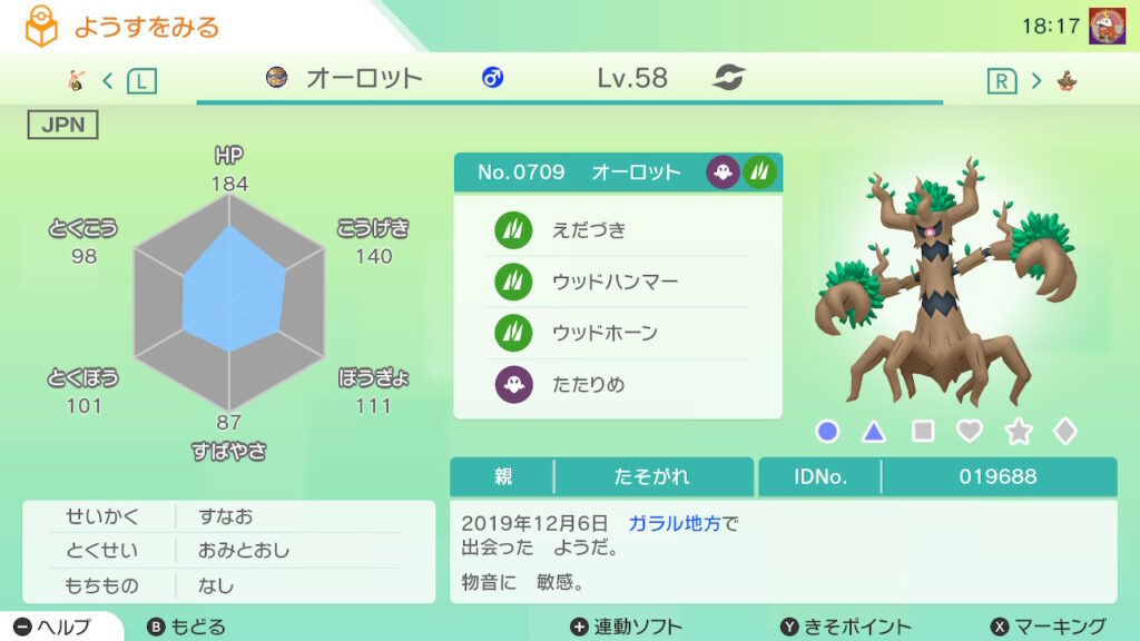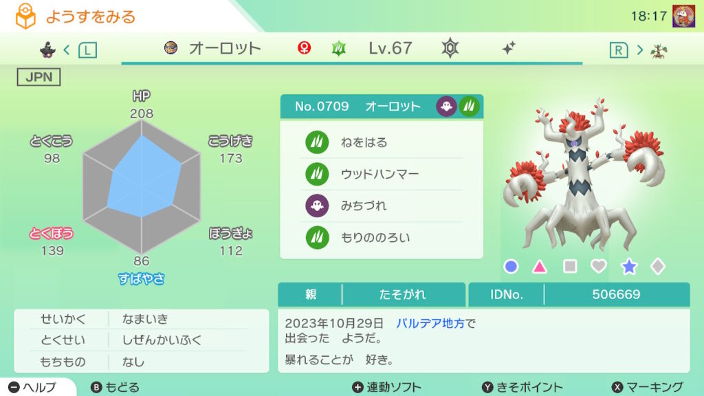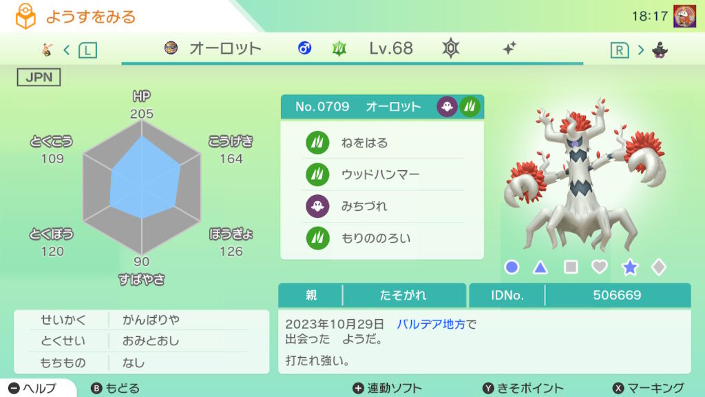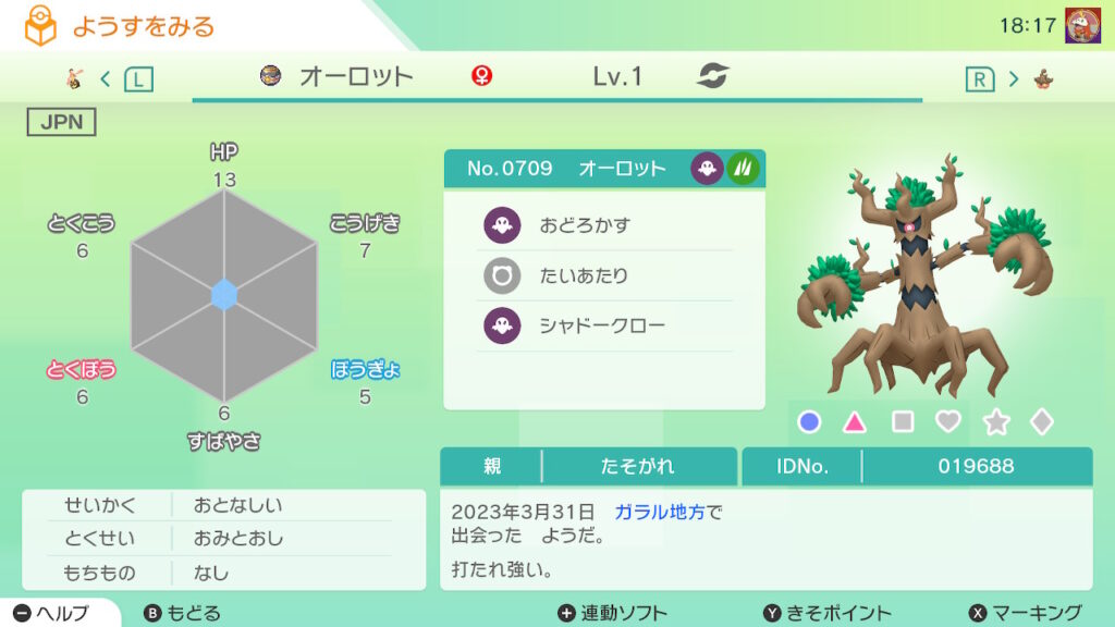 図鑑No.709 『オーロット』の色違いの見分け方をソフト別に解説