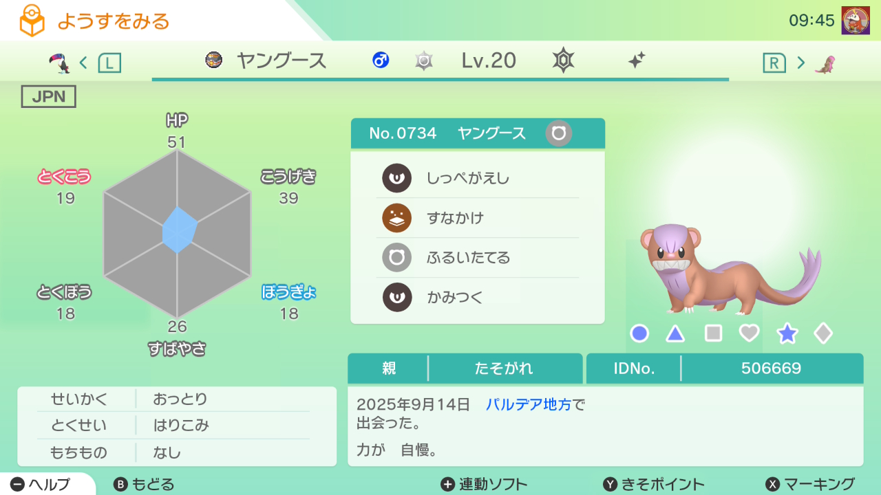 入手方法:野生通常色(♀) 入手バージョン:SV