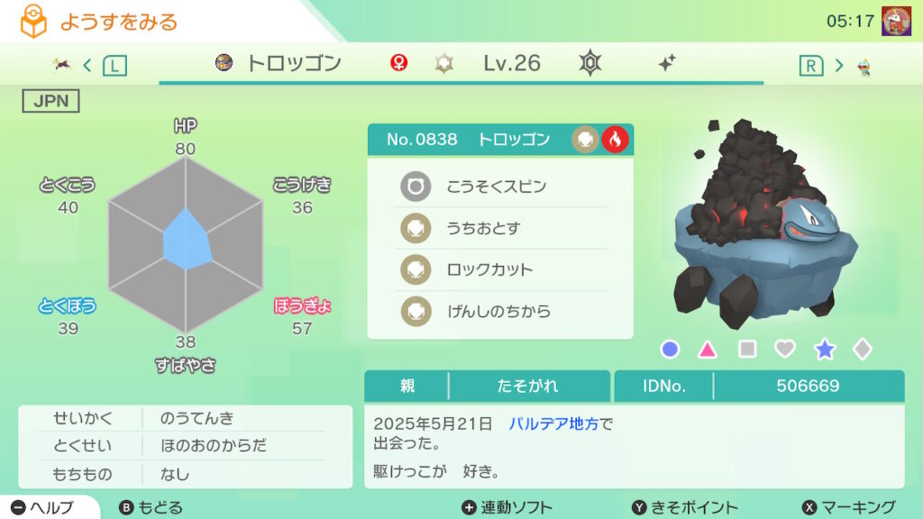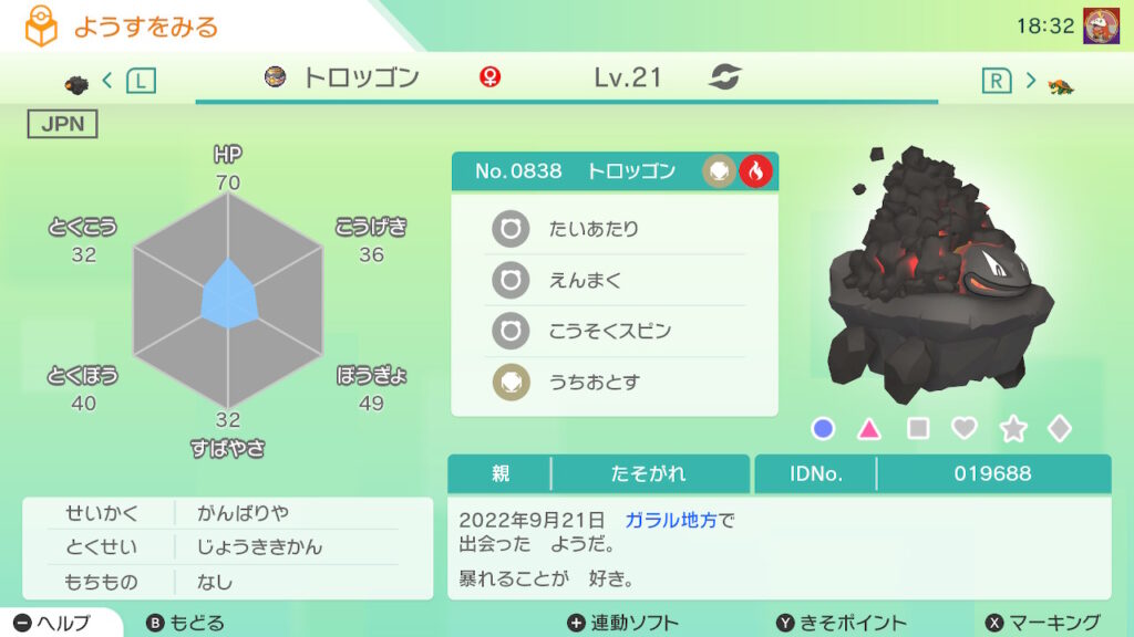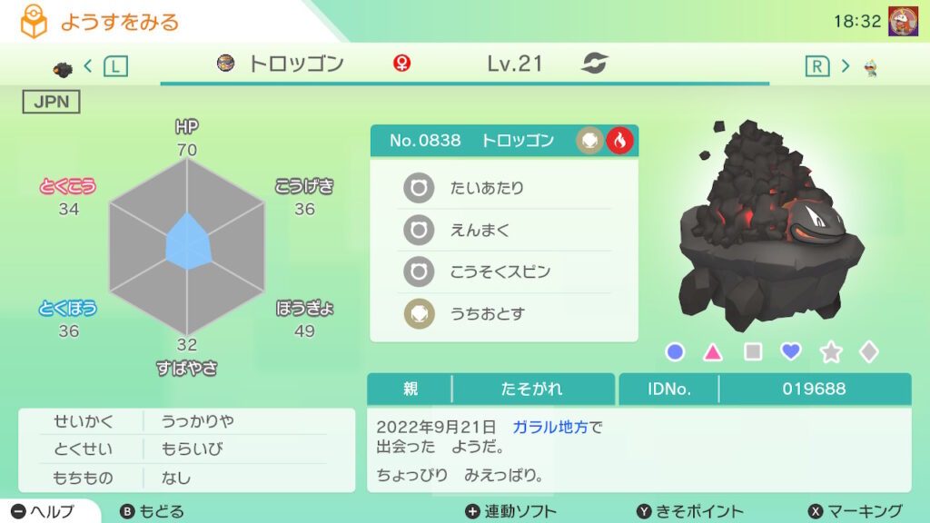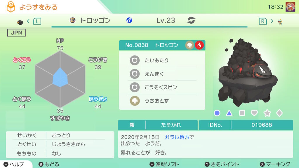 図鑑No.838 『トロッゴン』の色違いの見分け方をソフト別に解説