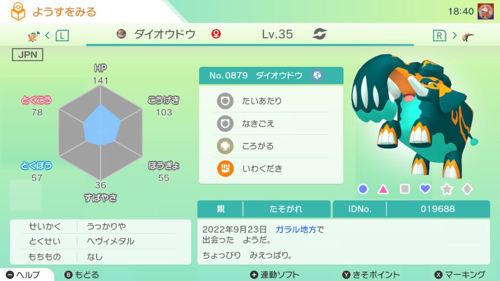 図鑑No.879 『ダイオウドウ』の色違いの見分け方をソフト別に解説