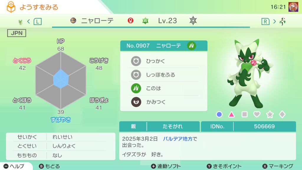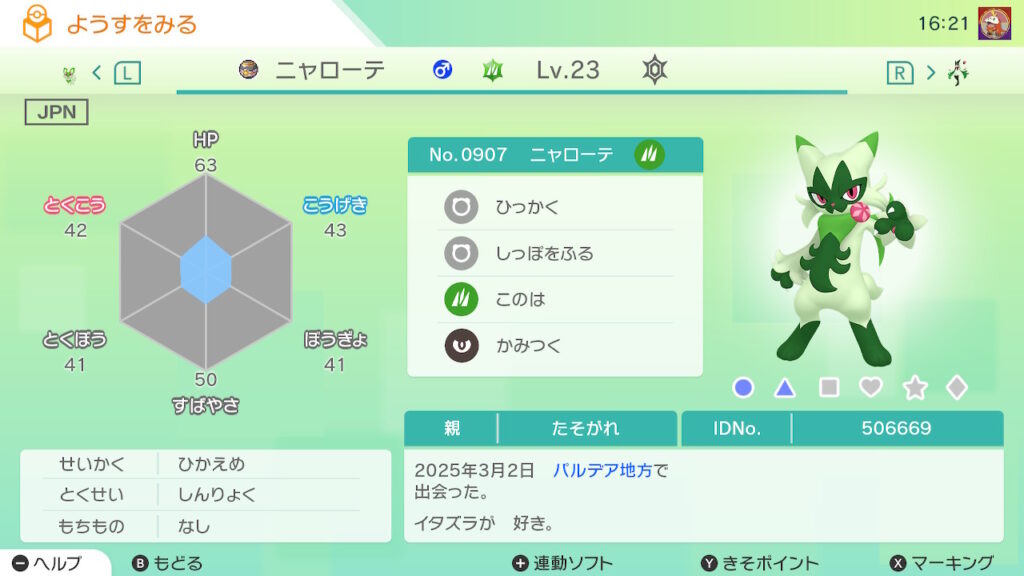 図鑑No.907 『ニャローテ』の色違いの見分け方をソフト別に解説
