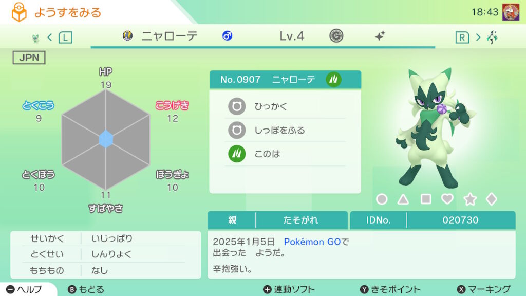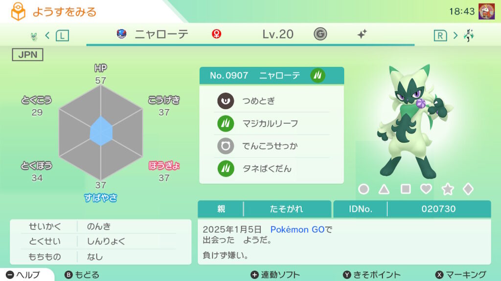 • 色違い(♀)がポケモンGO産のためゴージャスボールではない。