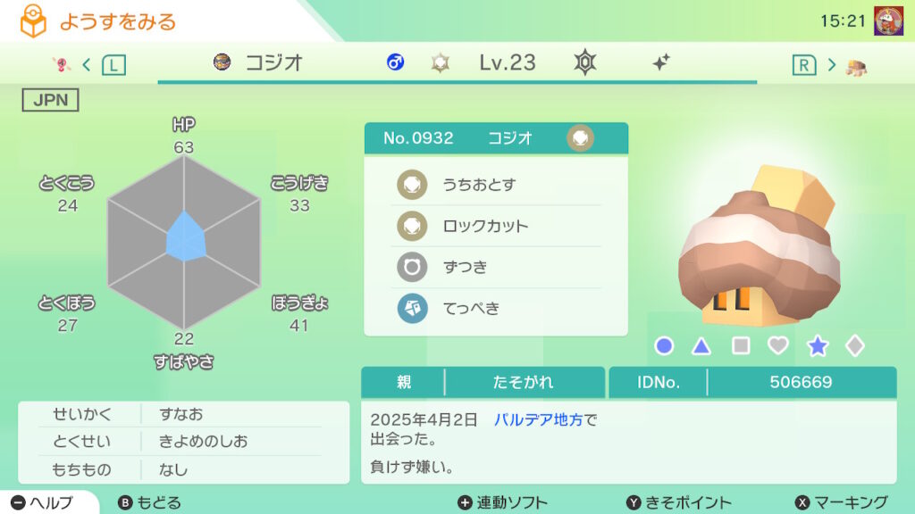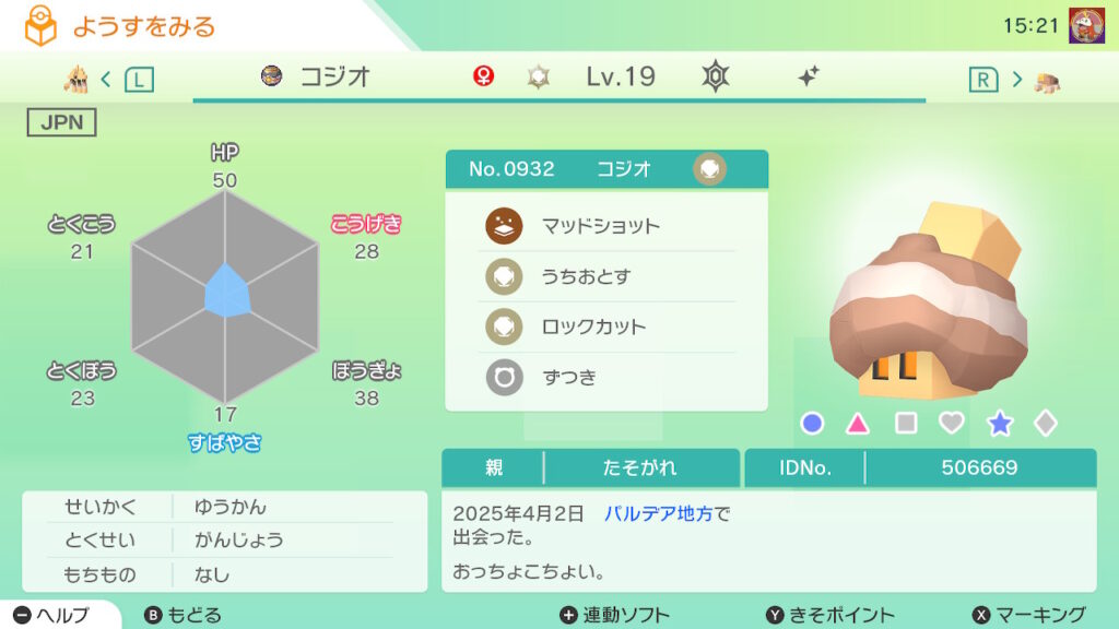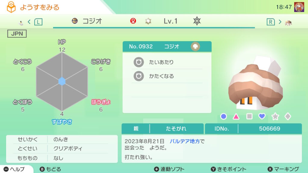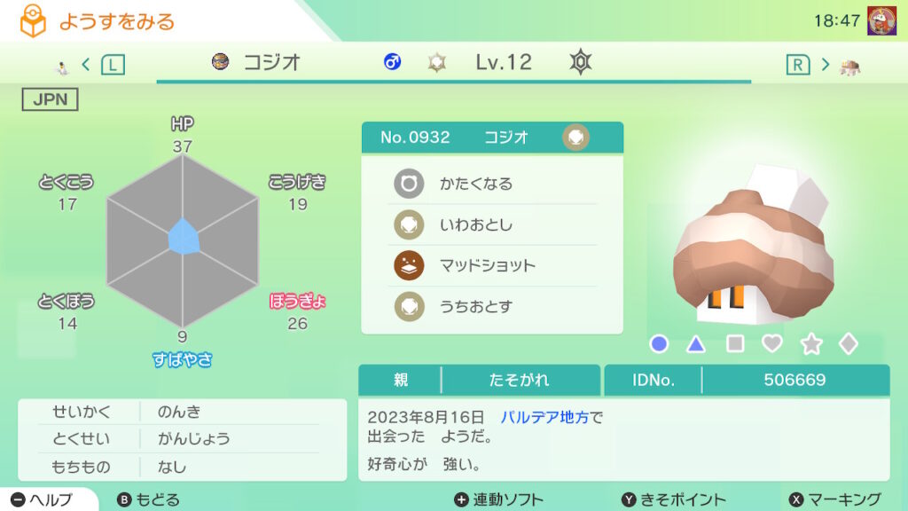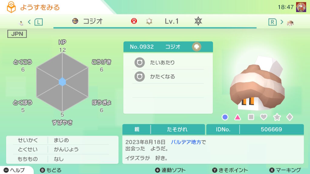 図鑑No.932 『コジオ』の色違いの見分け方をソフト別に解説