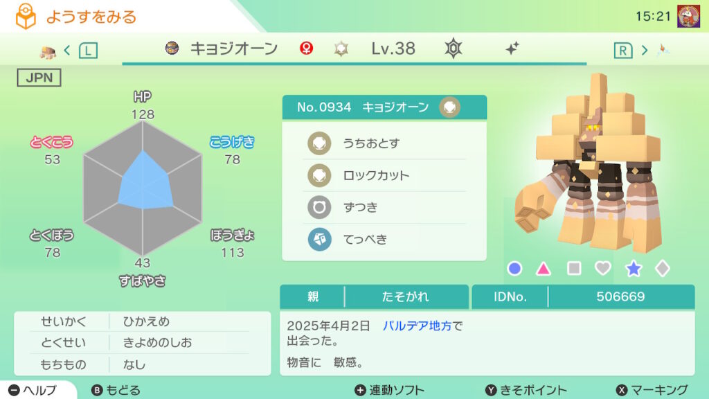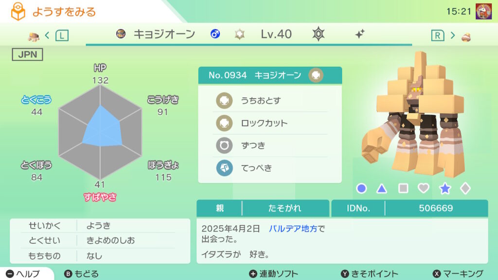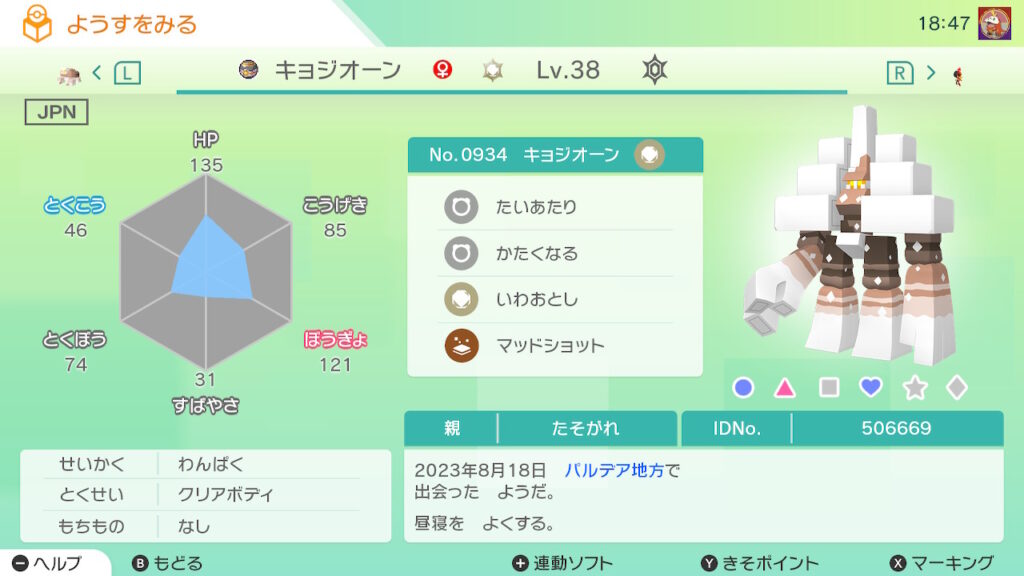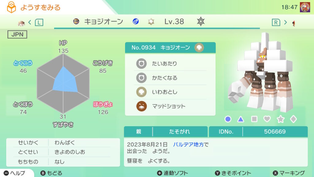 図鑑No.934 『キョジオーン』の色違いの見分け方をソフト別に解説